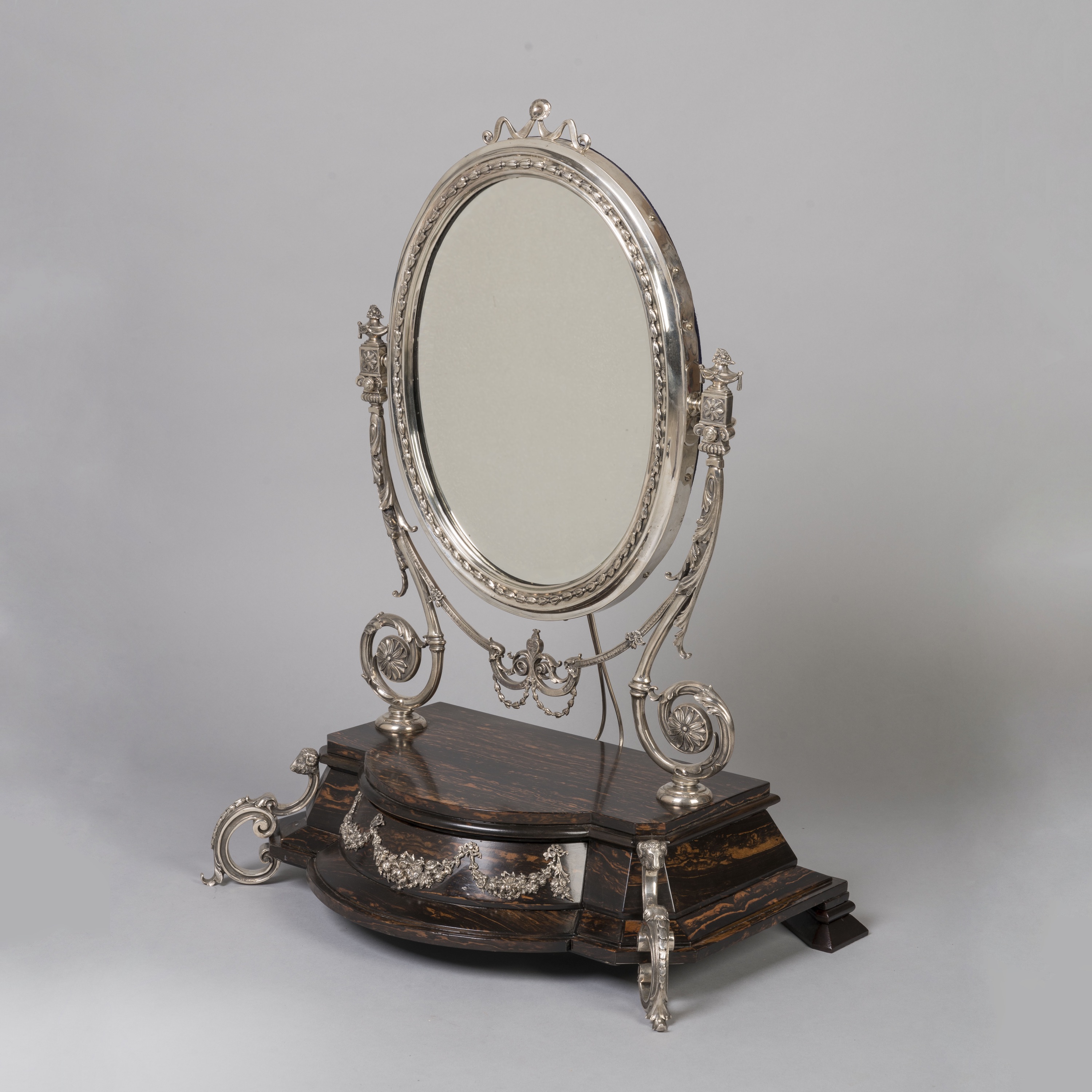 A very unusual item combining rare coromandel wood and solid sterling silver, the vanity mirror is supported on a coromandel base incorporating a hidden jewellery drawer in its curved front, faced with silver floral garlands and having angled corners dressed with silver C-scrolls terminating in rams’ heads. The oval mirror set within a detailed frame of running bellflowers with a decorative finial atop, attached to a hinged tilting mechanism beutifilly styled with neoclassical urns, acanthus foliage, scrolls, garlands, and rosettes. Fully hallmarked sterling silver.