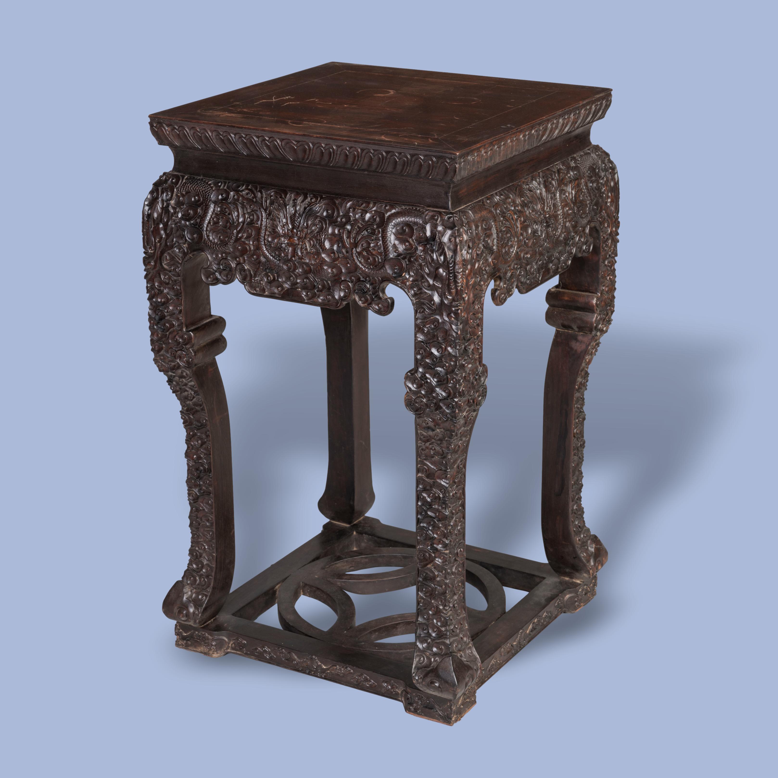 Carved from a dense Chinese hardwood, of square outline, the wooden top supported on an elaborate base carved throughout with geometric wave patterns, the corners with stylised elephants and the center of the skirting set with a Chinese dragon, the legs joined by an interlaces stretcher at the feet.