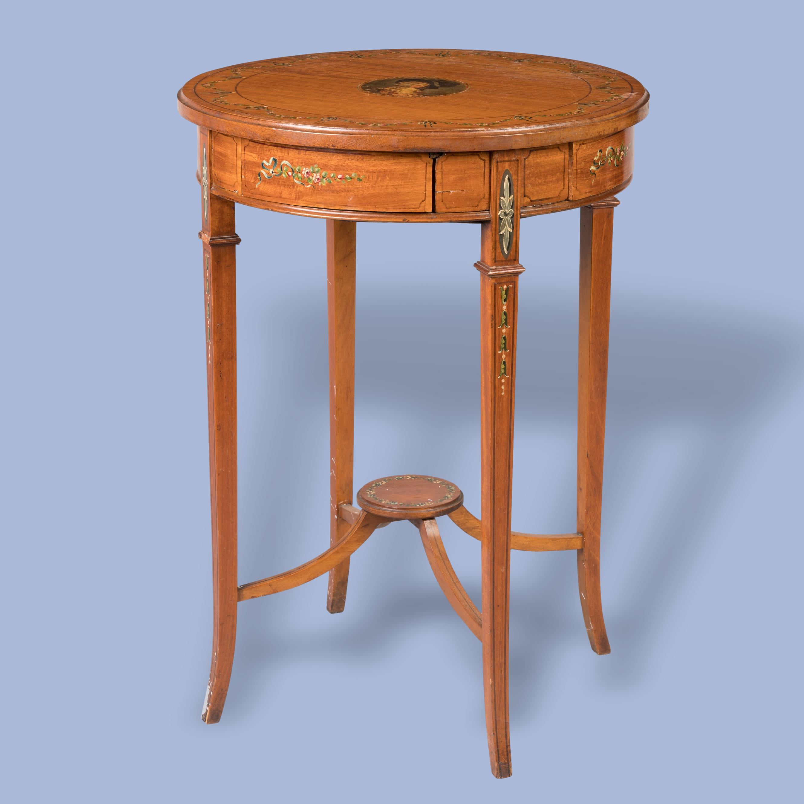 A lovely example of slender proportions, the round table is supported on square-section legs connected by a stretcher, the frieze enclosing lined drawers, painted with ribbon-tied floral swags; the top decorated in conforming style with a floral garland reserve and a painted cartouche of an elegant lady at the centre.