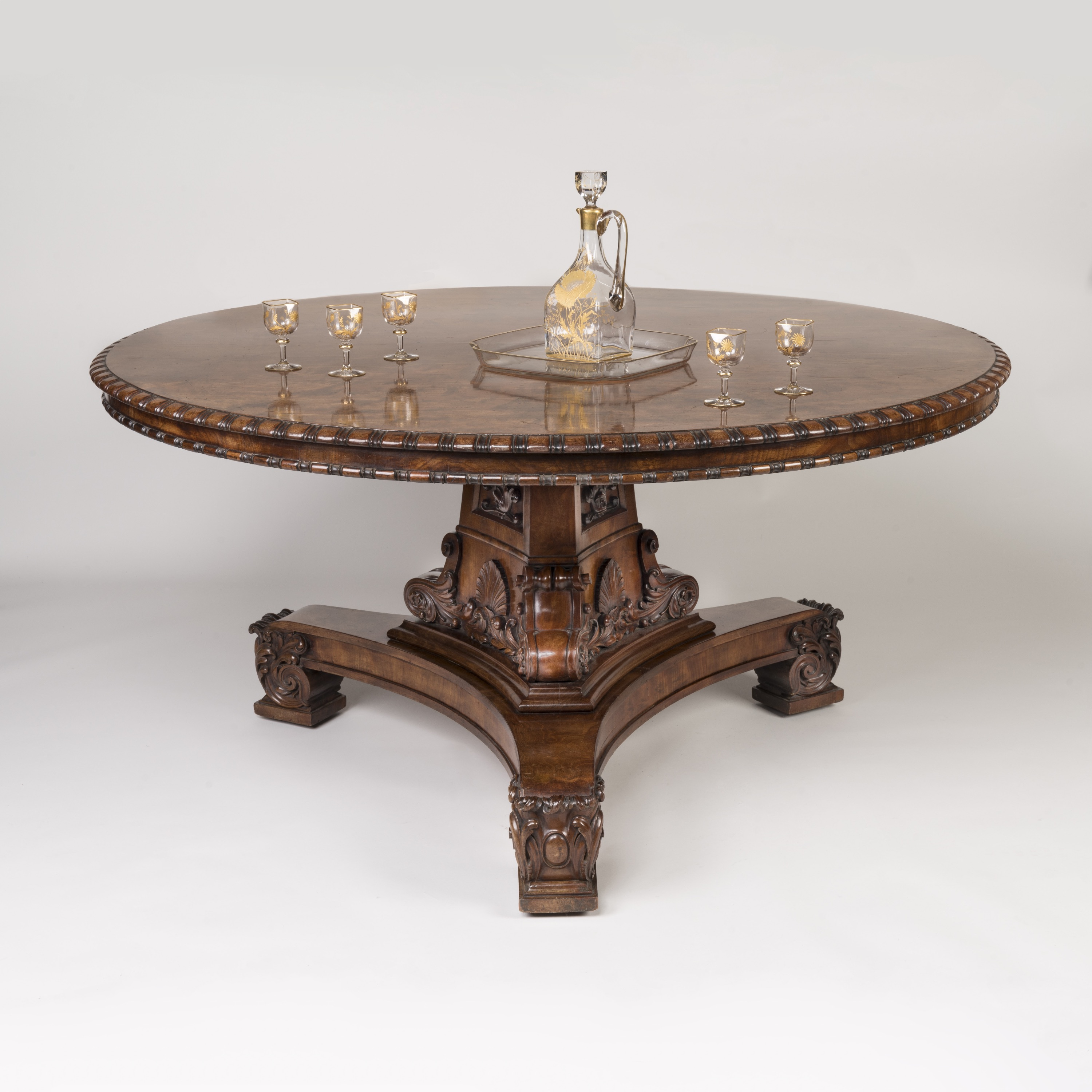 Constructed from a flamed Honduras Mahogany, book-matched with great effect on the top; the table supported on an incurved tripartite base with confident carved details including the scrolled acanthus feet and further carving of shells and foliate scrolls along the pillar; the circular top with a double-register carved edge. On hidden castors.