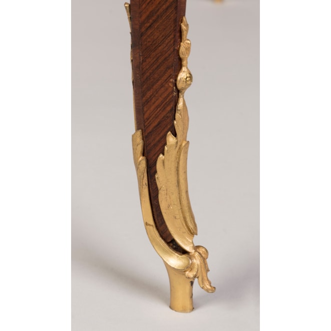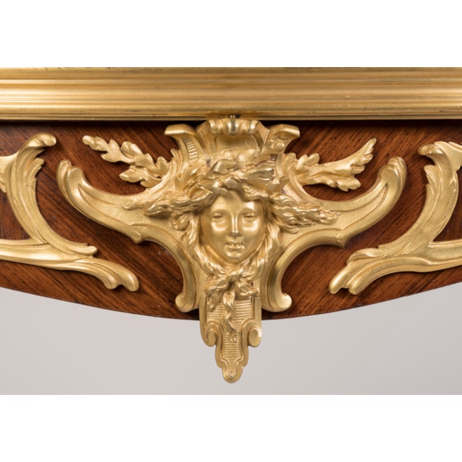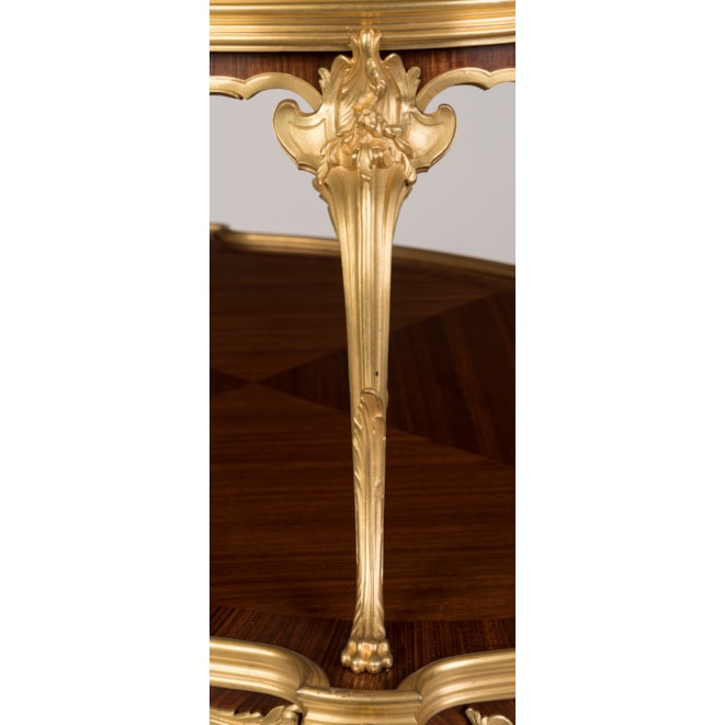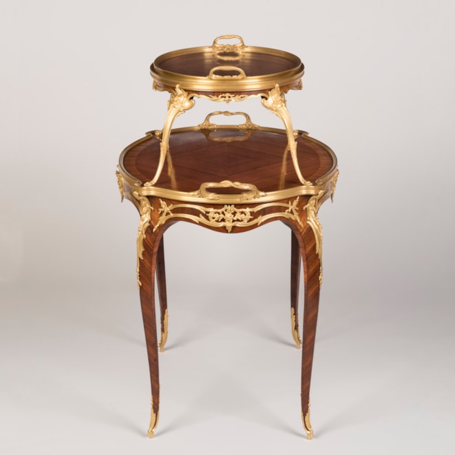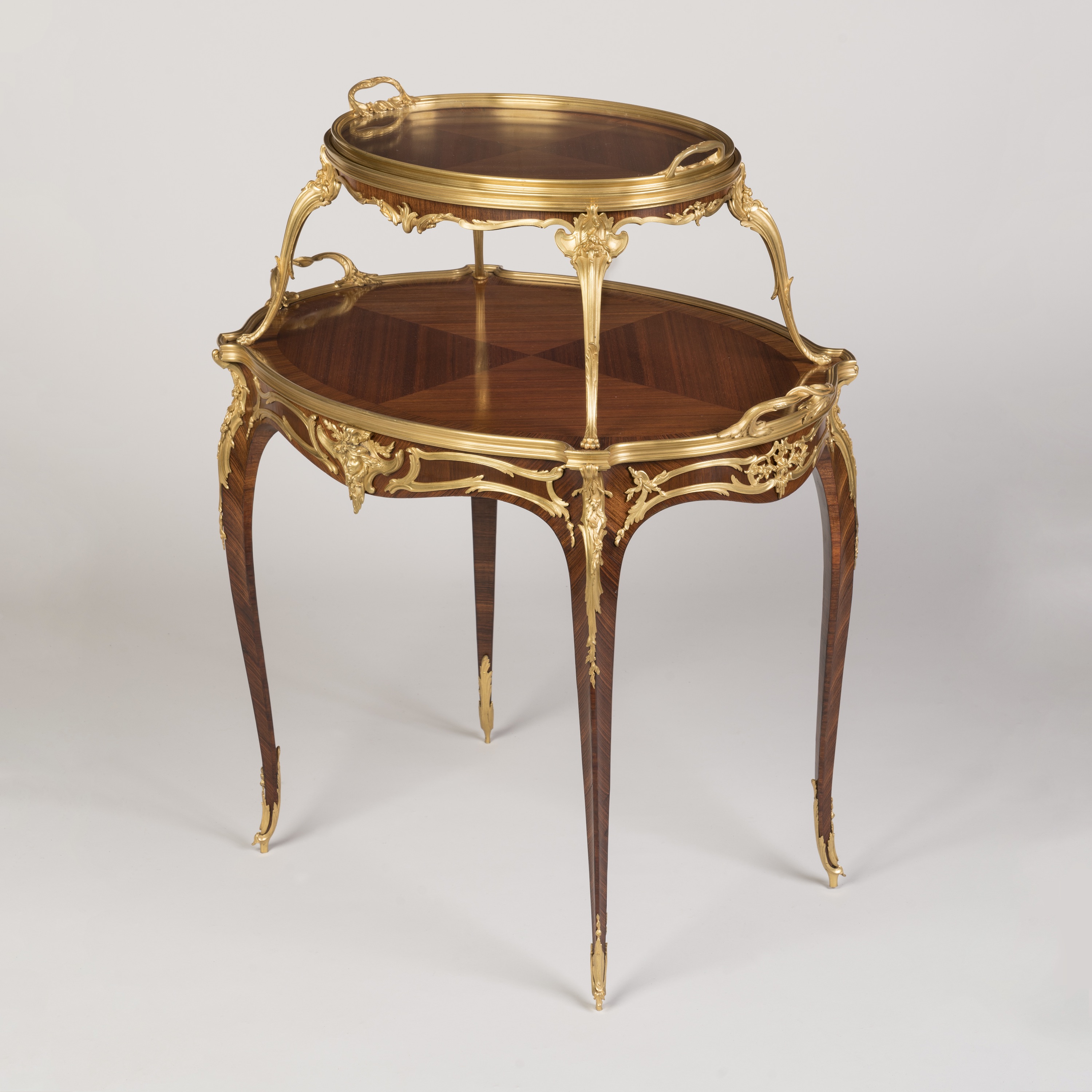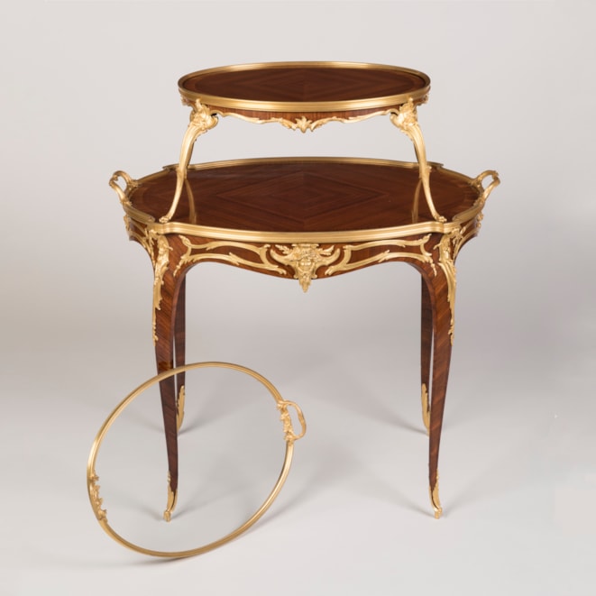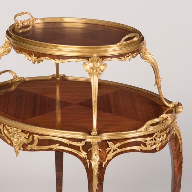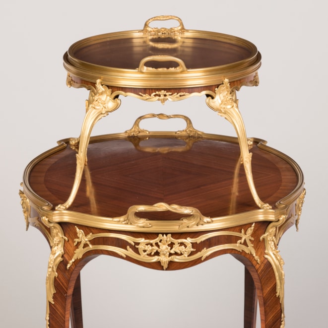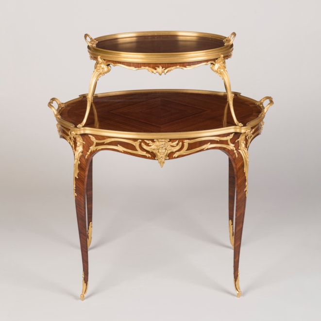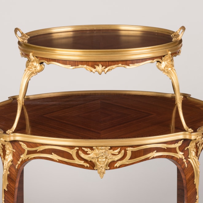A rare and documented example from the renowned Parisian atelier of Linke, this oval two-tier table is constructed using kingwood and adorned with finely detailed, fire-gilded, hand-chased bronze mounts. Supported by cabriole legs with elegant foliate sabots, the table incorporates espagnolettes of conforming design and a shaped apron decorated with ormolu scrollwork, accentuated by female masks. Both tiers are finished in quarter-matched kingwood, with the upper tier topped by a dual-handled glazed tray, resting on four ormolu scrolled legs with lion's paw feet. Signed to the ormolu guard 'F. Linke.'