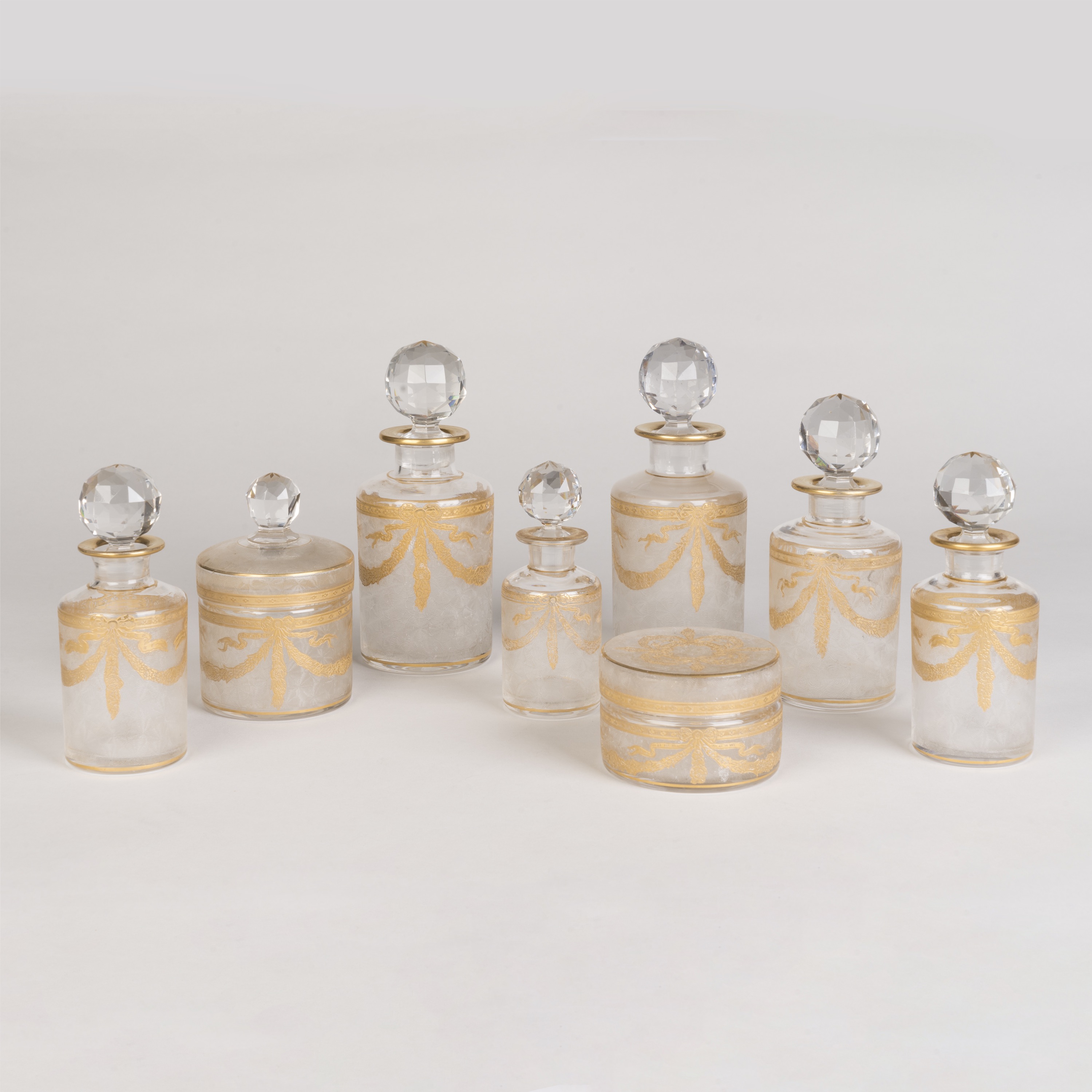 The set having stoppered bottles and lidded boxes, made from gilt cut and etched crystal consistent with the work produced by Baccarat or Saint Louis during the late 19th century.