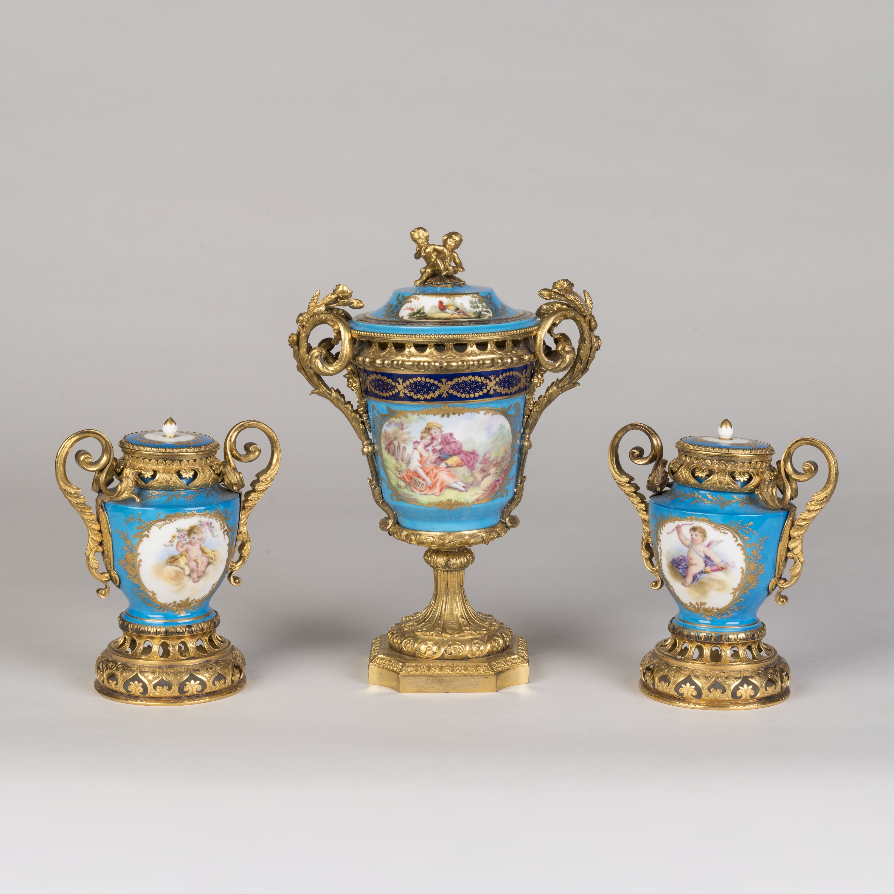 Consisting of a pair of turquoise hand-painted and gilt ormolu mounted small, lidded vases and a single larger turquoise hand-painted and gilt ormolu mounted lidded vase.