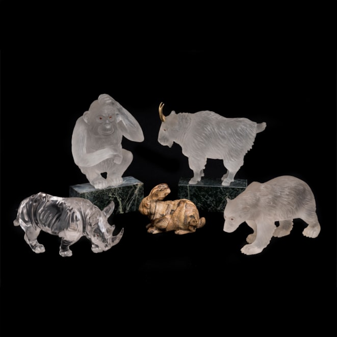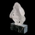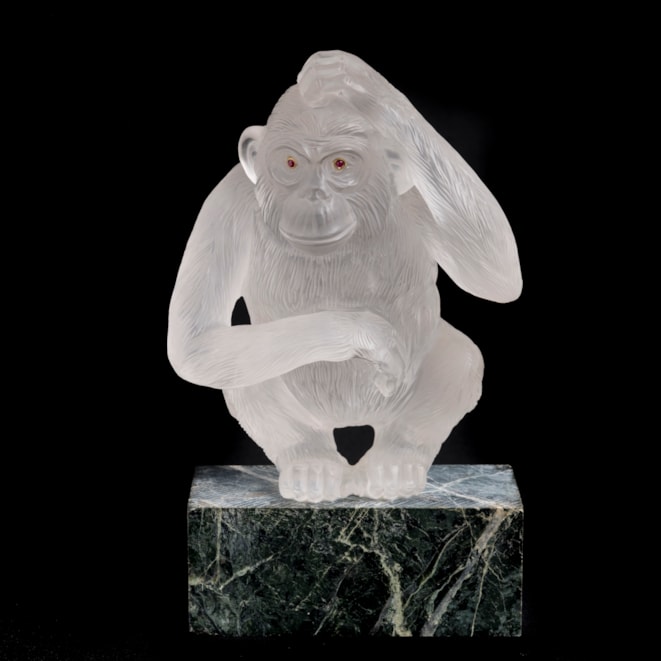 The crouching gorilla carved from one piece of crystal, mounted on a green marble plinth.