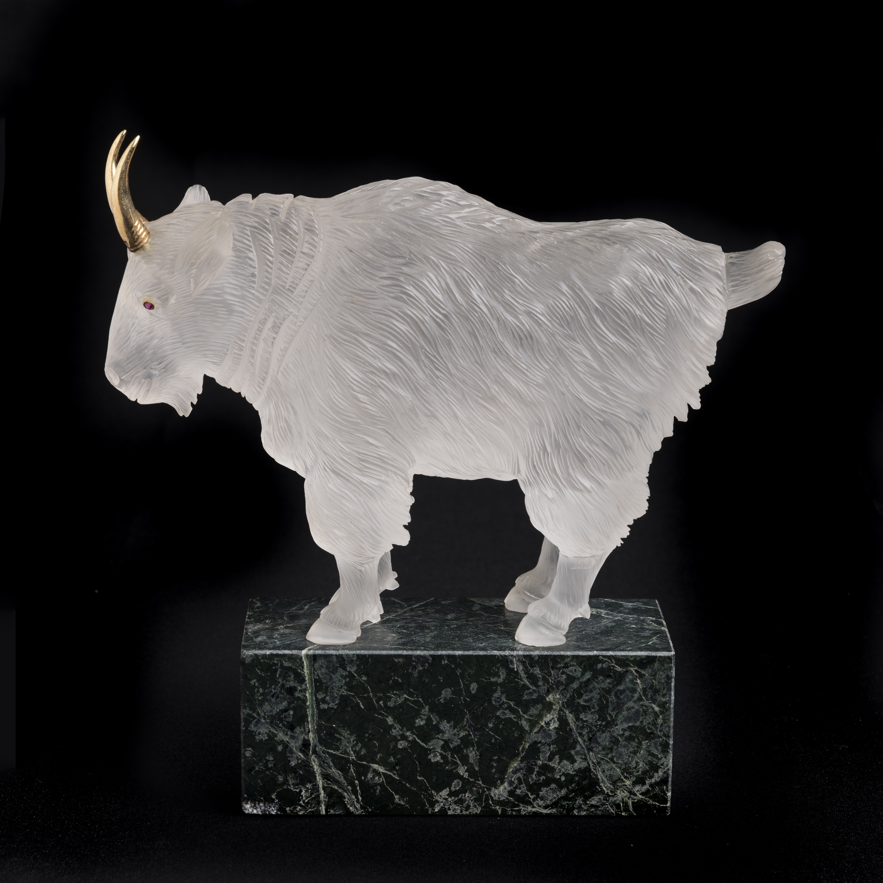 The standing goat carved from one piece of crystal, mounted on a green marble plinth.