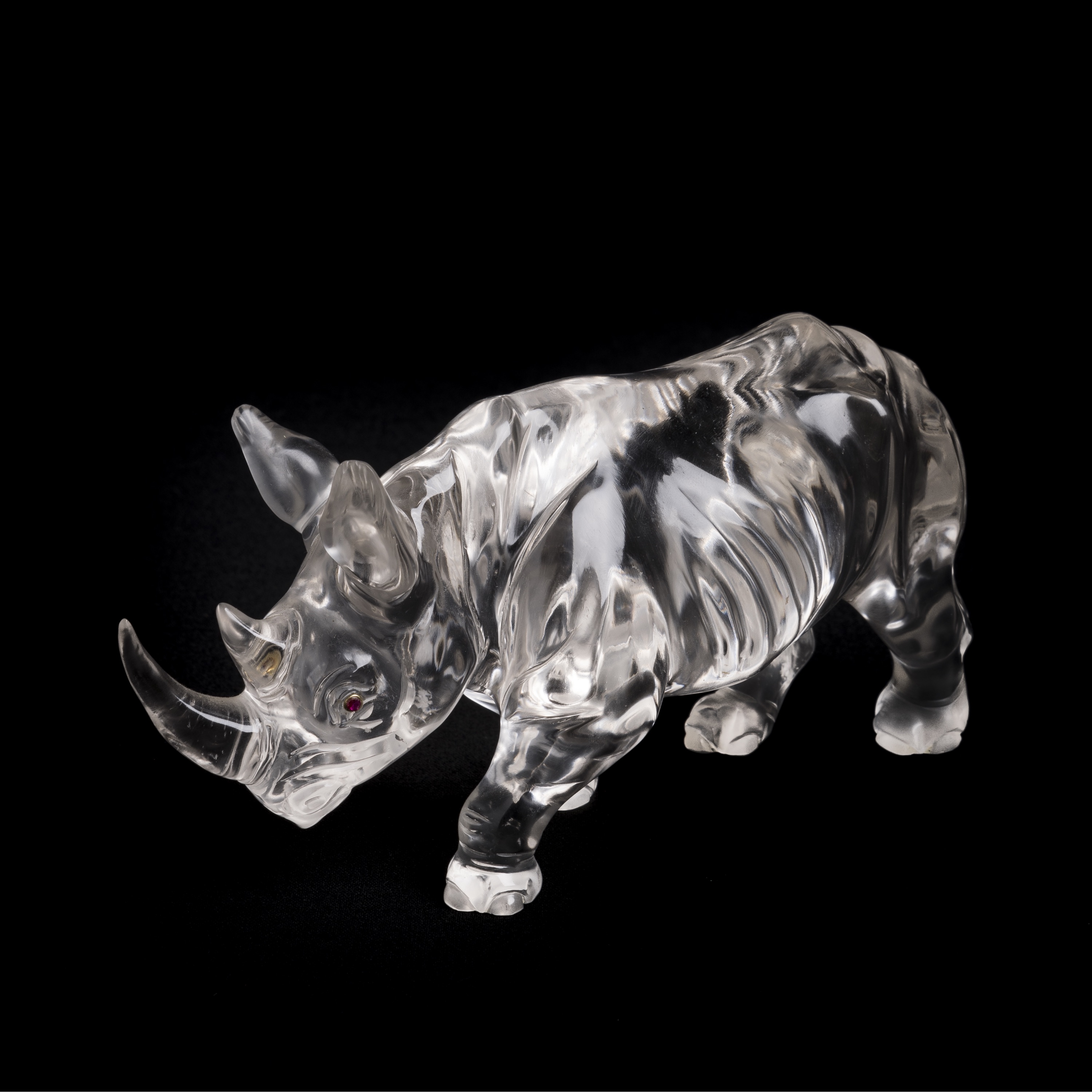 The standing rhinoceros carved from one piece of crystal, with inset eyes.