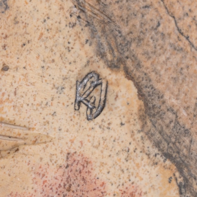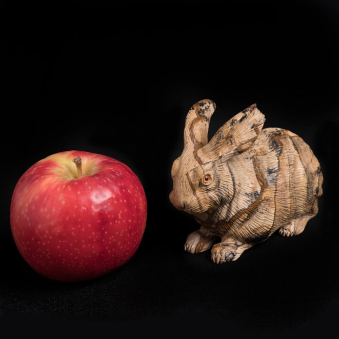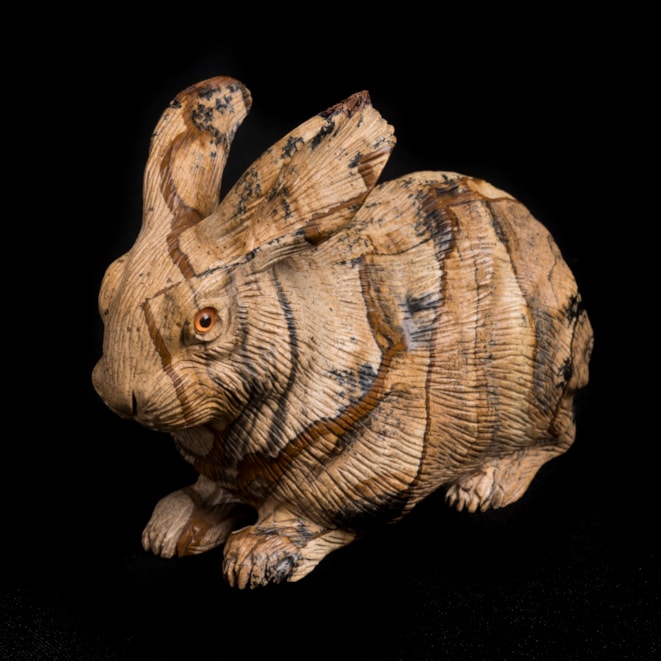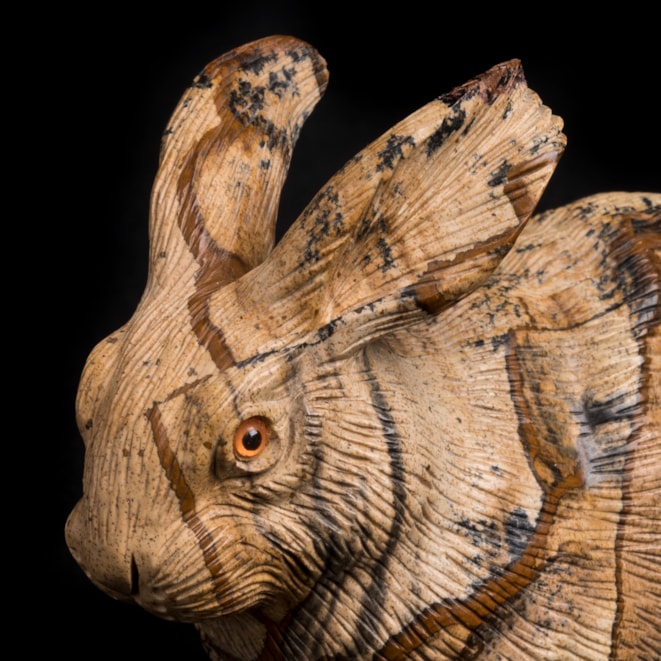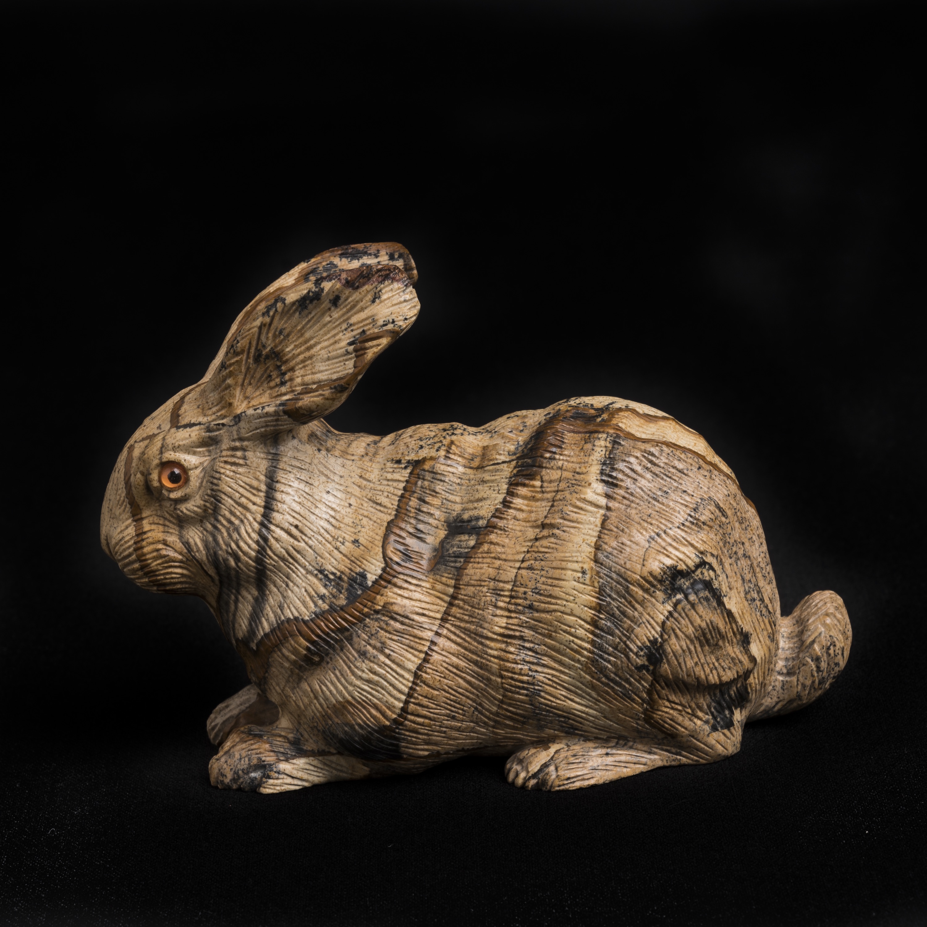 The hare carved from a single piece of stone, with realistic glass inset eyes.