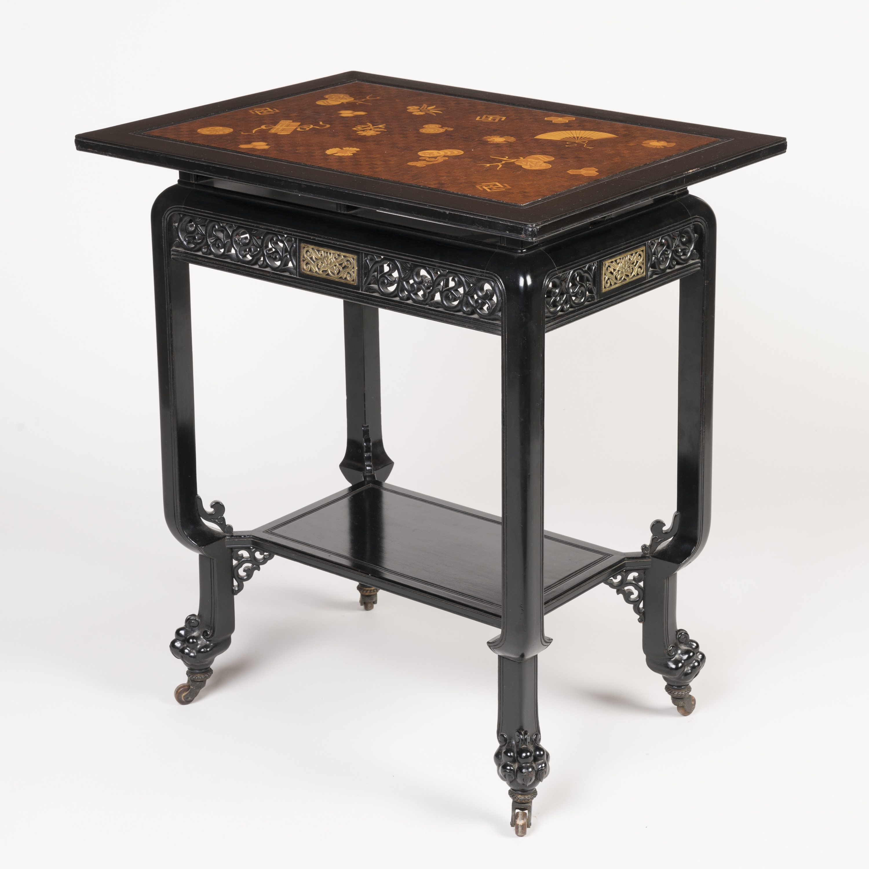 Designed in the exotic style associated with the French 'japonisme' movement and the English Aesthetic movement, the table combines ebonised wood with bois satiné, boxwood and brass. The ebonised top inset with a marquetry panel of oriental symbols and motifs, including parchment scrolls, exotic birds, kanji, and a fan, all inlaid within a basketweave parquetry background. The platform top floating on block buffers and a pierced and scrolled frieze, each side set with a brass central plaque. Supported on square section legs transitioning into inverted cabriole forms, joined by an undertier and terminating in claw feet and castors.