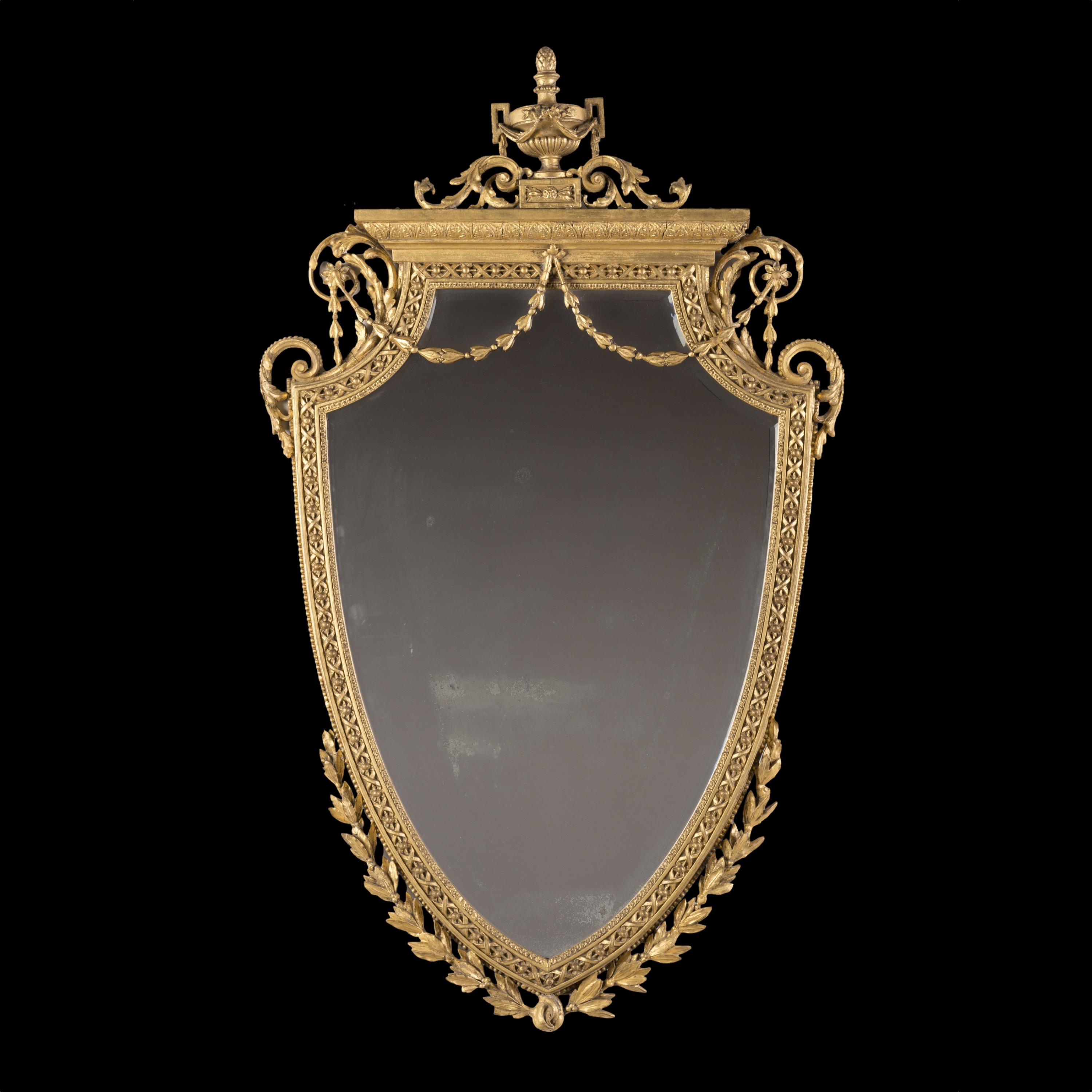 Carved from wood and elaborated with gesso detailing, the shield-shape mirror plate with beveled edge and housed in a gilded frame, with intricate, scrolling designs and decorative elements including acanthus leaves, flowers, and a central urn-shaped element at the top.