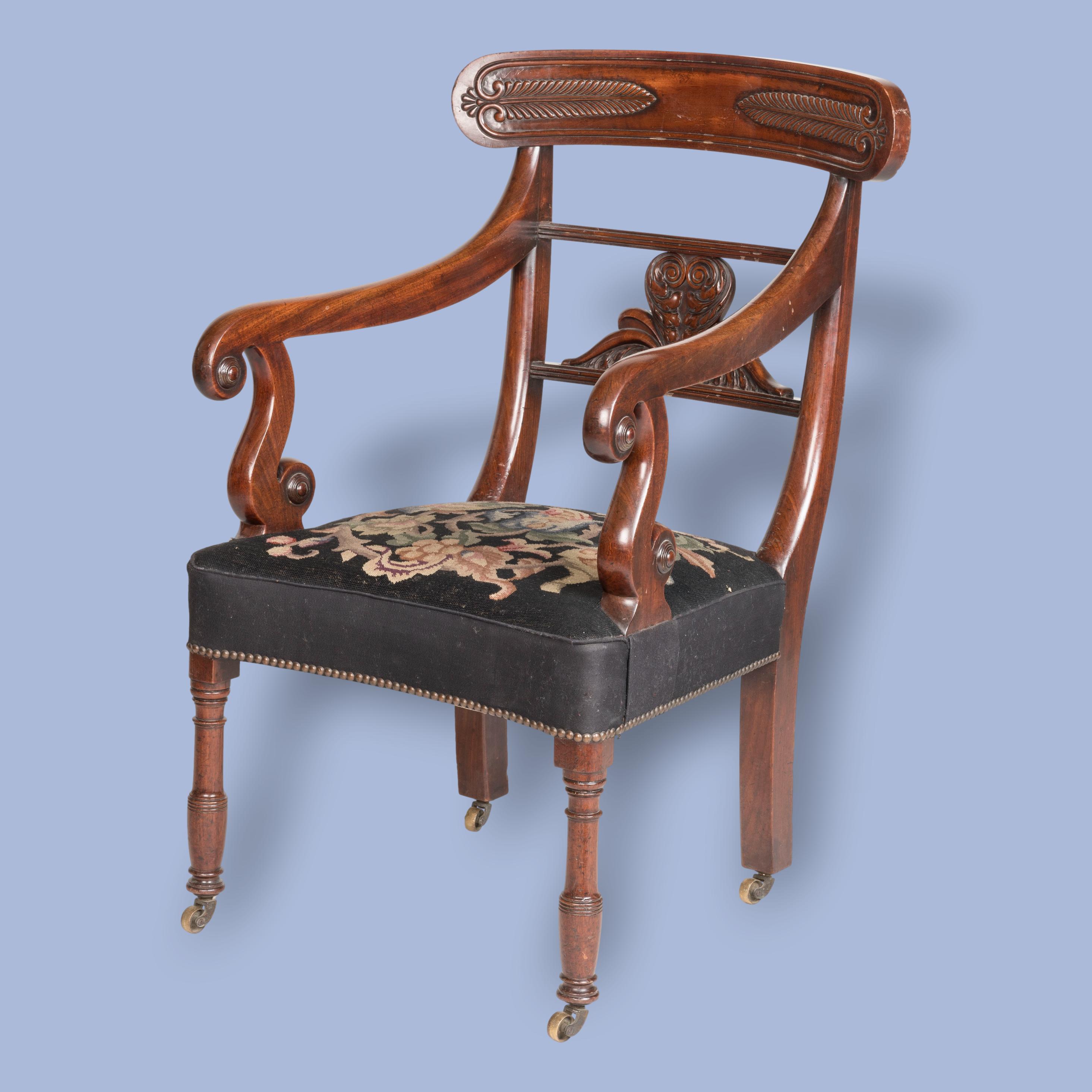 Constructed in a well patinated mahogany, and having a gros point tapestry seat cover; castor shod, the front legs of turned cylindrical form, with horizontal reeding, with the square section rear legs leading into the shaped and swept back uprights, terminating in an incurved toprail carved with addorsed palmettes; below, two crossbars house a central carved backrest; the swept and scrolled arms frame the incurved, upholstered and close brass nailed seat.