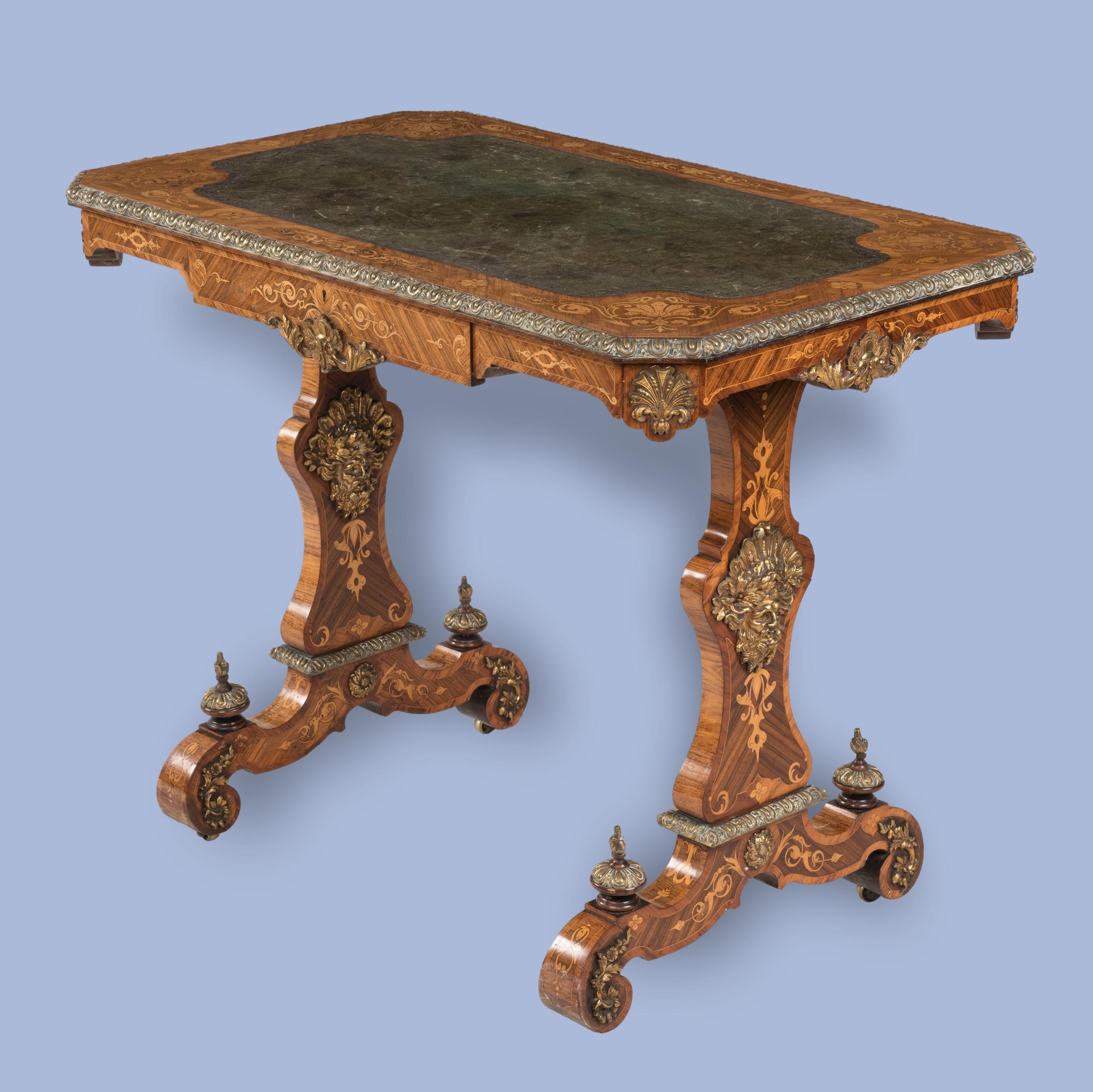 Employing fine veneers of kingwood and tulipwood alongside various specimen woods encompassed in the marquetry, the end support ormolu-mounted table having downward curved scrolling feet with decorative finials, the waisted supports with male masks on a quarter-veneered and crossbanded ground; above, the writing platform with canted corners with its original green leather tooled top within a floral marquetry border, a lockable drawer incorporated within the frieze of conforming style.