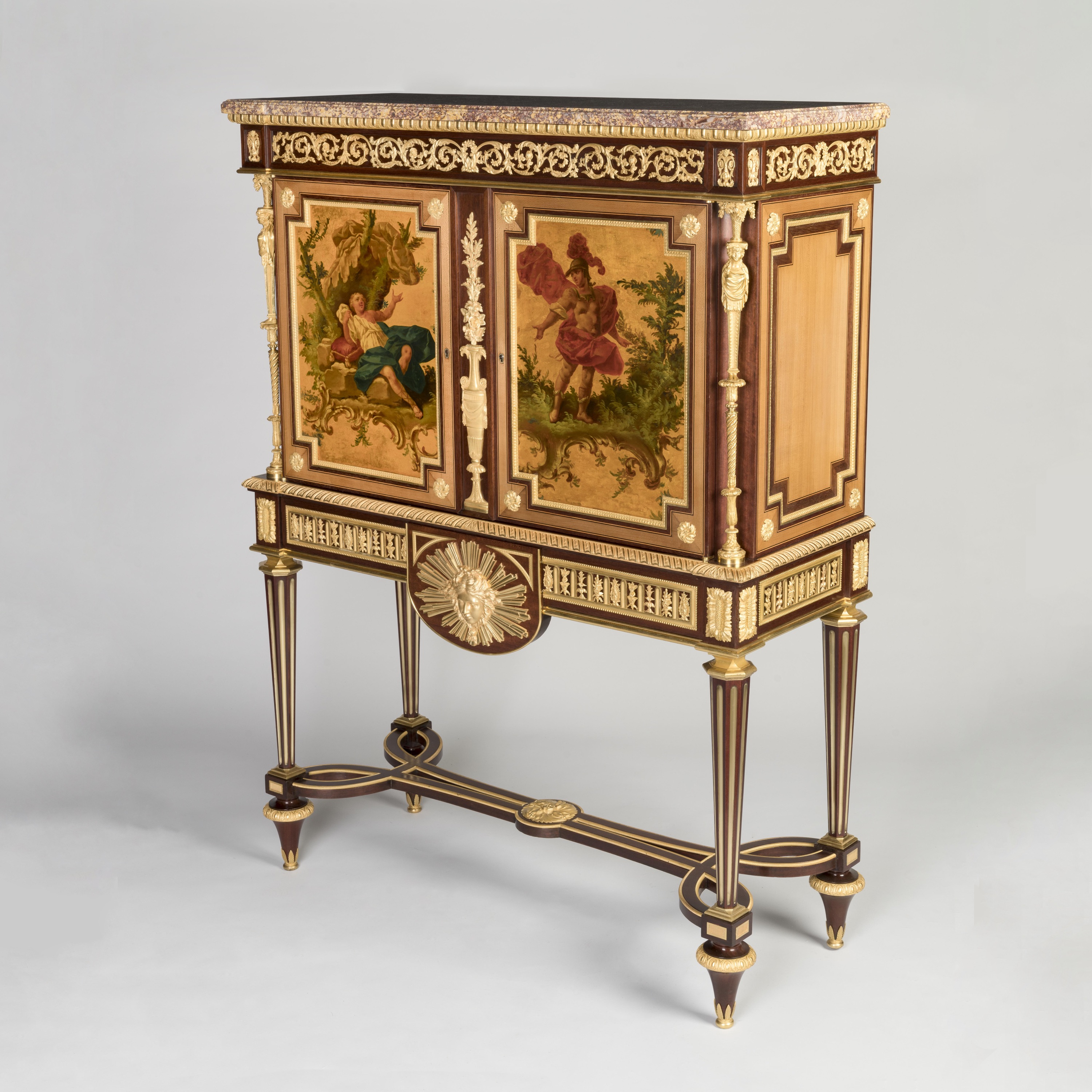 Surmounted by its original double-moulded Brocatelle d'Espagne marble top and constructed from bois citronnier, mahogany, highlighted with boxwood stringing and dressed with hand-chased, burnished ormolu mounts, the cabinet supported on tapering fluted legs, expertly inlaid with concave brass filets, terminating on toupie feet with foliate cast sabots, the legs connected with a looped stretcher, the apron centred by a large mask of the sun god Apollo, concealing a subdivided drawer opened with a spring-button mechanism, the cabinet's doors centred with painted Vernis Martin panels of Venus & Aeneas opening to reveal a shelved interior. The corners of the cabinet are defined by ormolu female caryatids while the sides are finished with crossbanded and strung bois citronnier and ormolu paterae below a frieze inset with ormolu foliate rinceaux and an egg-and-dart moulding. The carcass stamped 'Henry Dasson' twice.