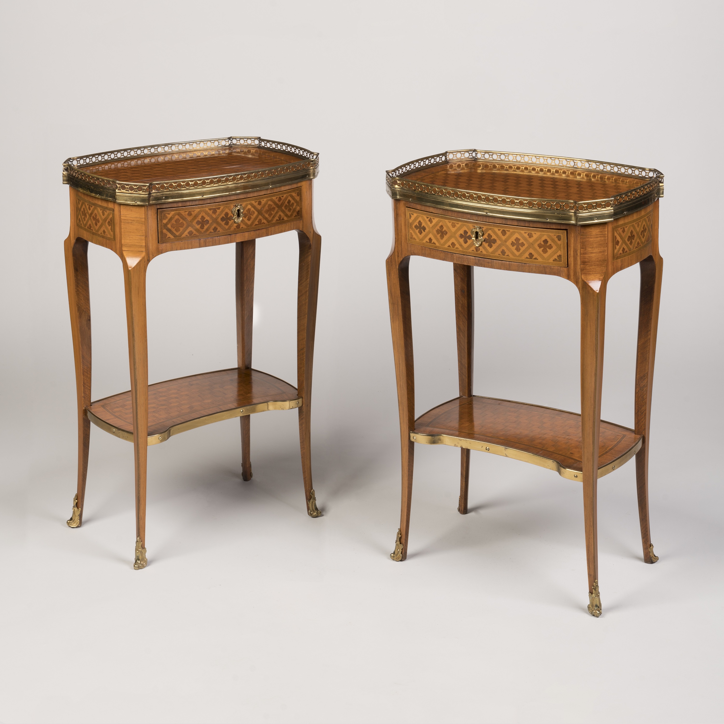 Constructed in Kingwood, with precise parquetry and marquetry inlays; rising from swept cabriole legs with ormolu sabots, joined by a crossbanded undertier, the frieze inlaid with geometric floral motifs and housing a single lockable drawer below the cube parquetry top surmounted by a pierced gilt brass gallery.