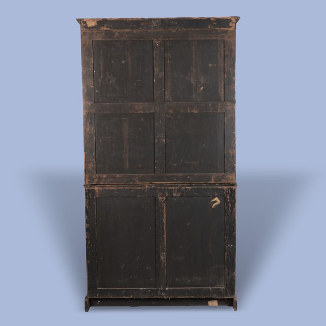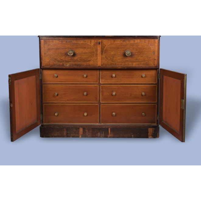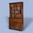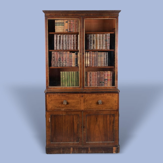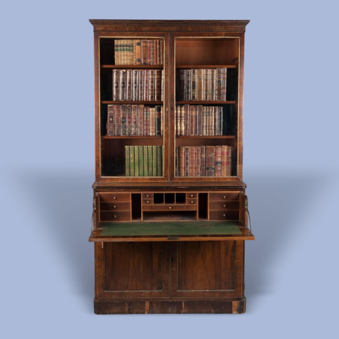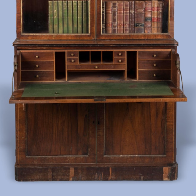Employing figured rosewood, the upper section with a moulded cornice above a pair of glazed doors with gilt surrounds, enclosing three adjustable shelves; the lower section fitted as a secretaire, the fall-front  mimicking two drawers with oval paterae handles, opening to reveal a finely fitted interior of small drawers and pigeonholes with a green leather writing surface; below, a pair of doors conceals an arrangement of six drawers with brass pulls. The whole raised on a plinth base with rounded corners. Stamped Wilton & Co.