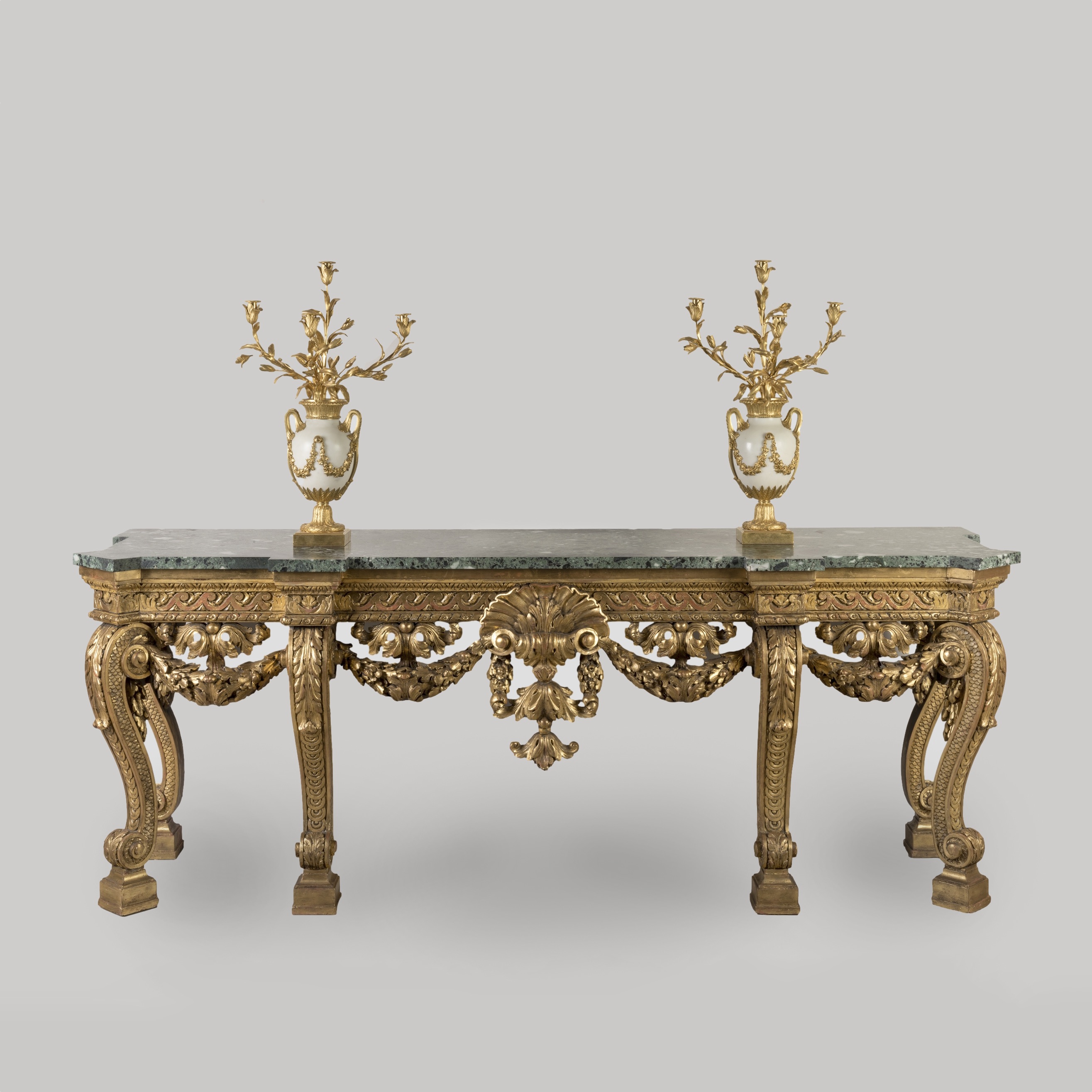 Of grand stately proportions and constructed in carved gilt wood, with six cabriole legs on scrolled block feet, dressed with acanthus leaves, with guilloches, to the faces, imbrications to the sides, supporting an addorsed Vitruvian scroll faced apron, centred with an oversize Venus scallop shell, issuing knotted oak leaf garlands and pendants. The everted platform is of green breccia marble.