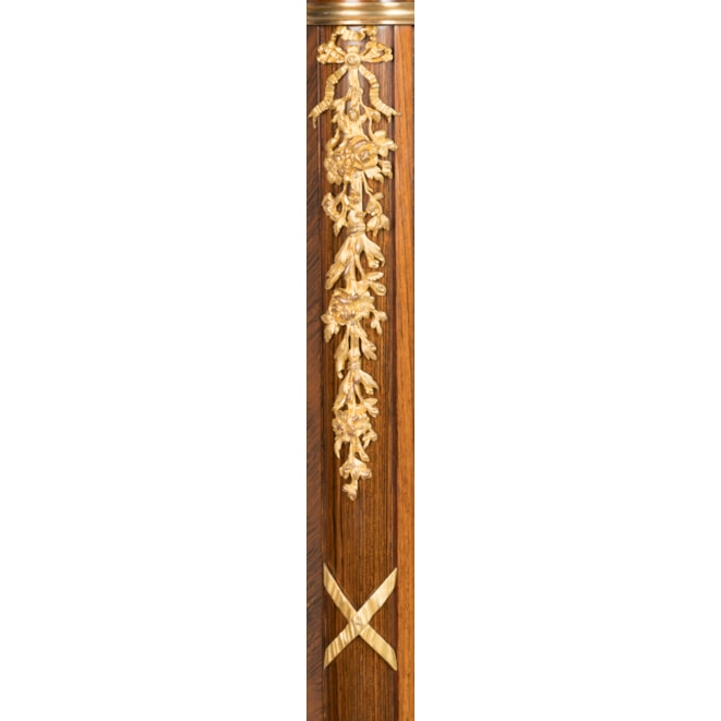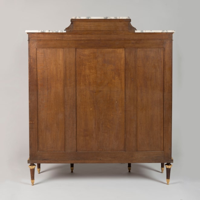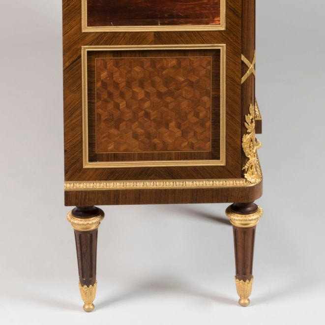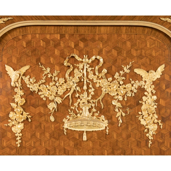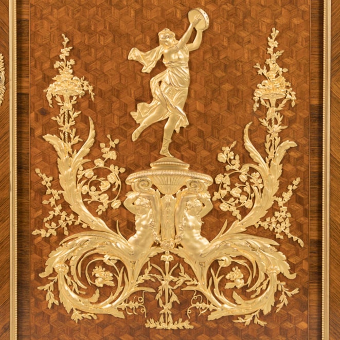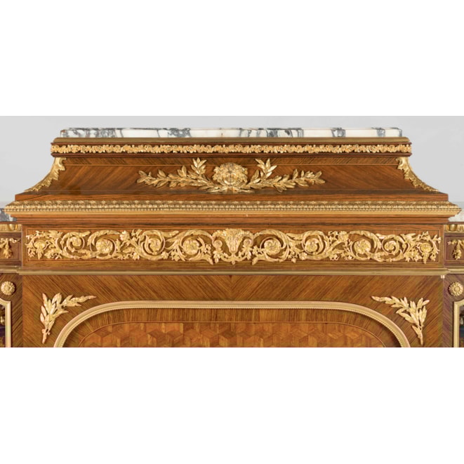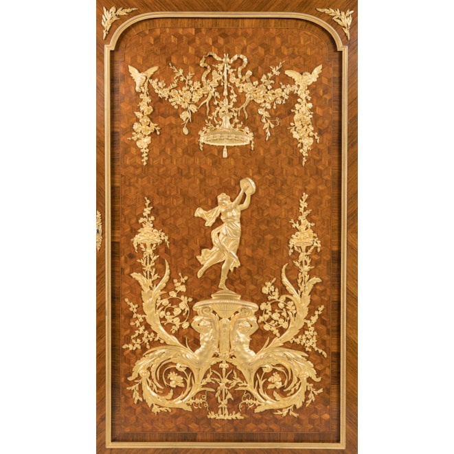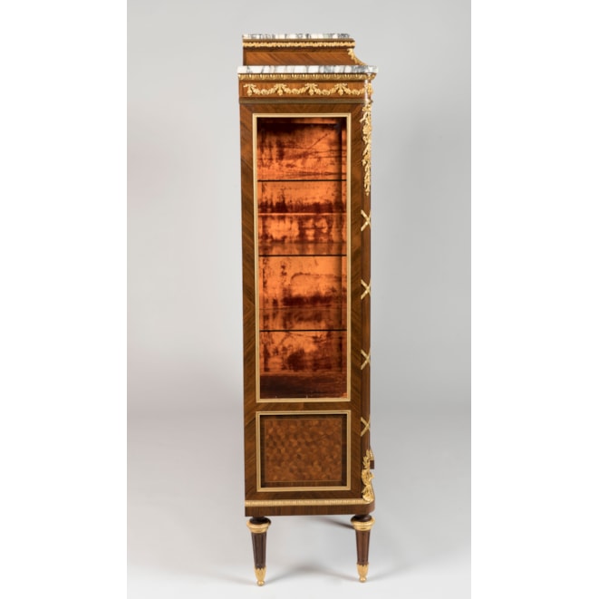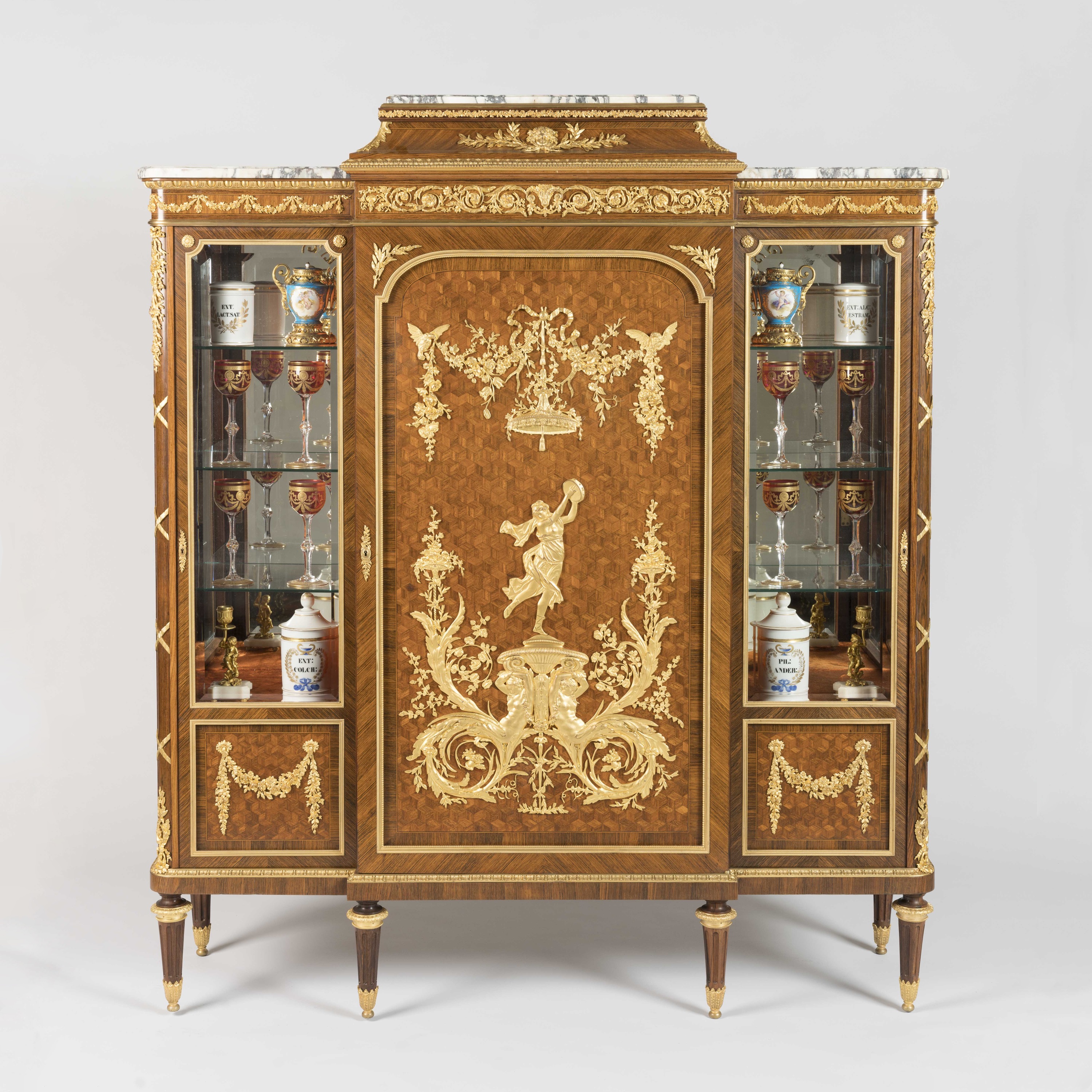 Of elegant breakfront form, surmounted by a stepped pediment top inset with three shaped and moulded breccia marble slabs within an egg-and-dart moulded surround, the scrolled frieze above a central door of cubed bois satiné parquetry and mounted with a superb gilt-bronze figure of Erato, the Muse of Poetry, dancing with a tambourine amidst foliate scrollwork atop a classical urn supported by herm figures. The door opens to reveal an oak-lined interior with four adjustable shelves. Flanked by glazed vitrines to either side, each with bevelled glass doors and mirrored backs enclosing three glass shelves and a fabric lining, the uprights adorned with ribbon-tied foliate clasps, and raised on fluted tapering legs terminating in leaf-cast sabots. The lock signed 'Linke' and the back of the mounts bearing the initials 'FL.'
