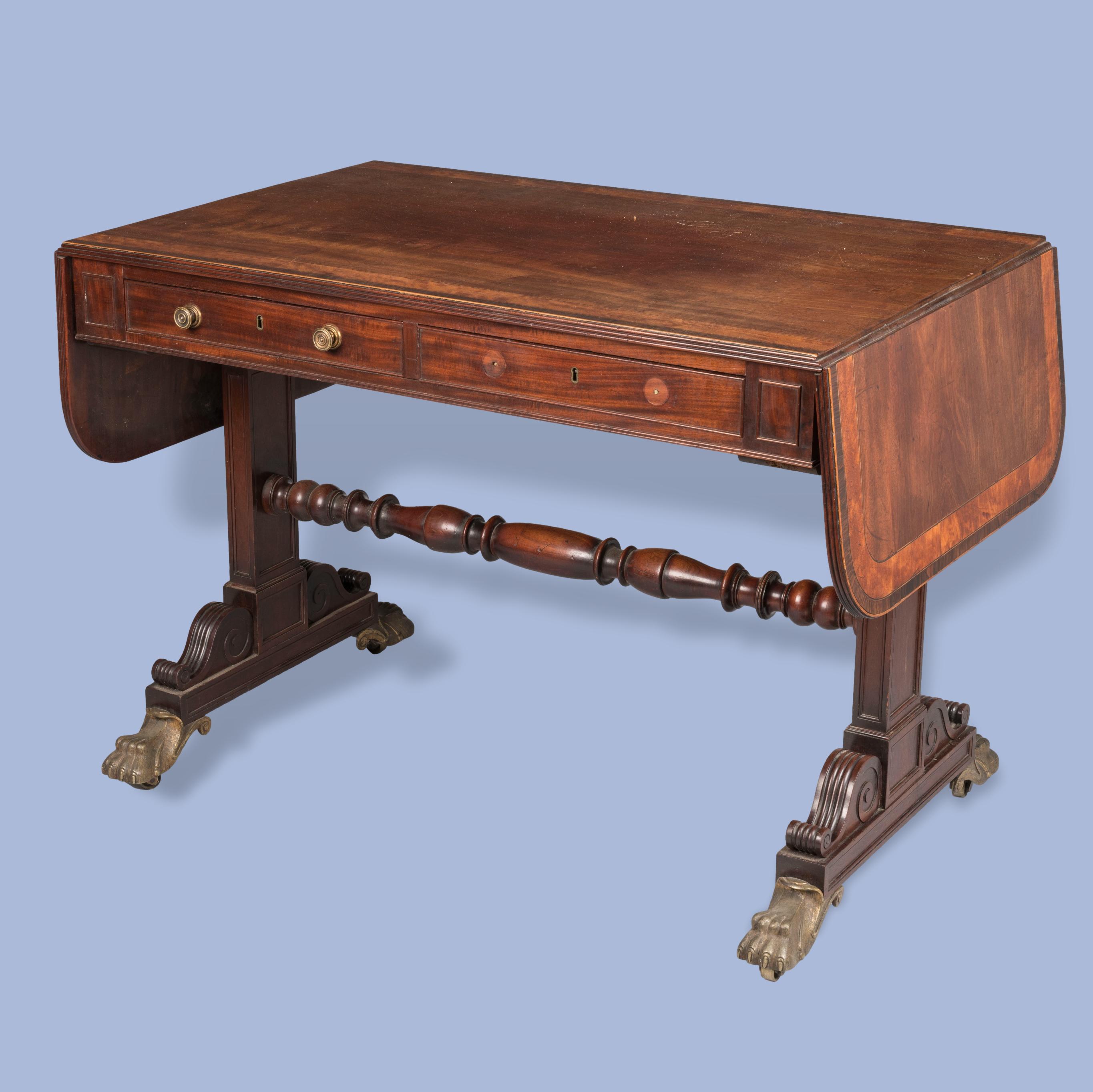 The finely figured, rounded rectangular mahogany top with twin hinged flaps, satinwood crossbanding and a reeded edge, above a pair of frieze drawers opposed by false drawer fronts. Raised on rectiniliner end-supports with panelled decoration and scrolling volutes, joined by a turned baluster stretcher and terminating in brass paw feet and castors.