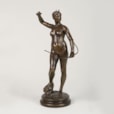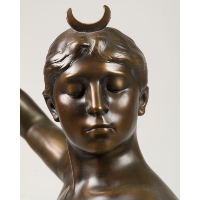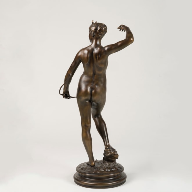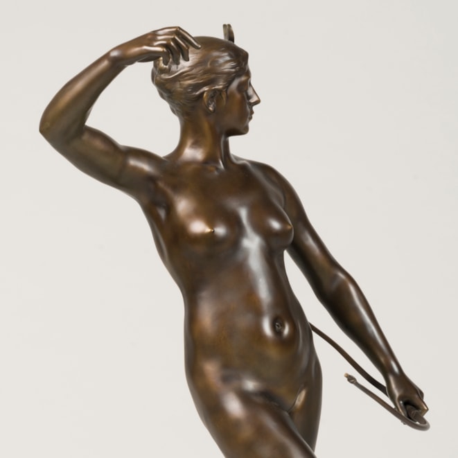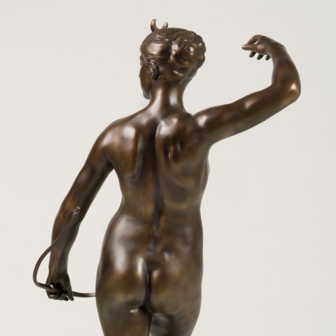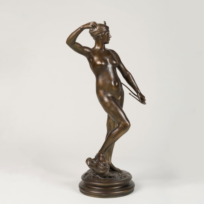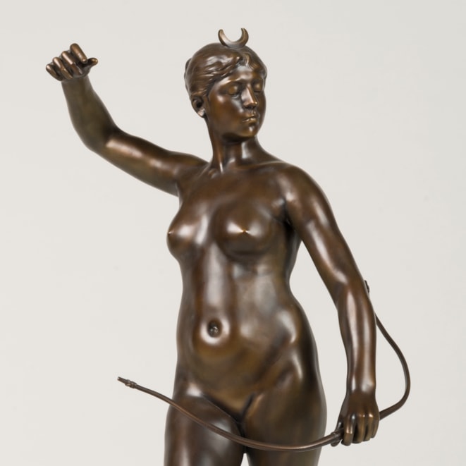 Falguière's Diana was exhibited in plaster at the Salon of 1882 to widespread acclaim and became his most celebrated work. Diana epitomises Falguière's piquant ability to bring together the realistic bodies of 19th Century models and the elevated goddess subject. As one critic wrote of his figures, they "seemed to show the traces of a recently removed corset."