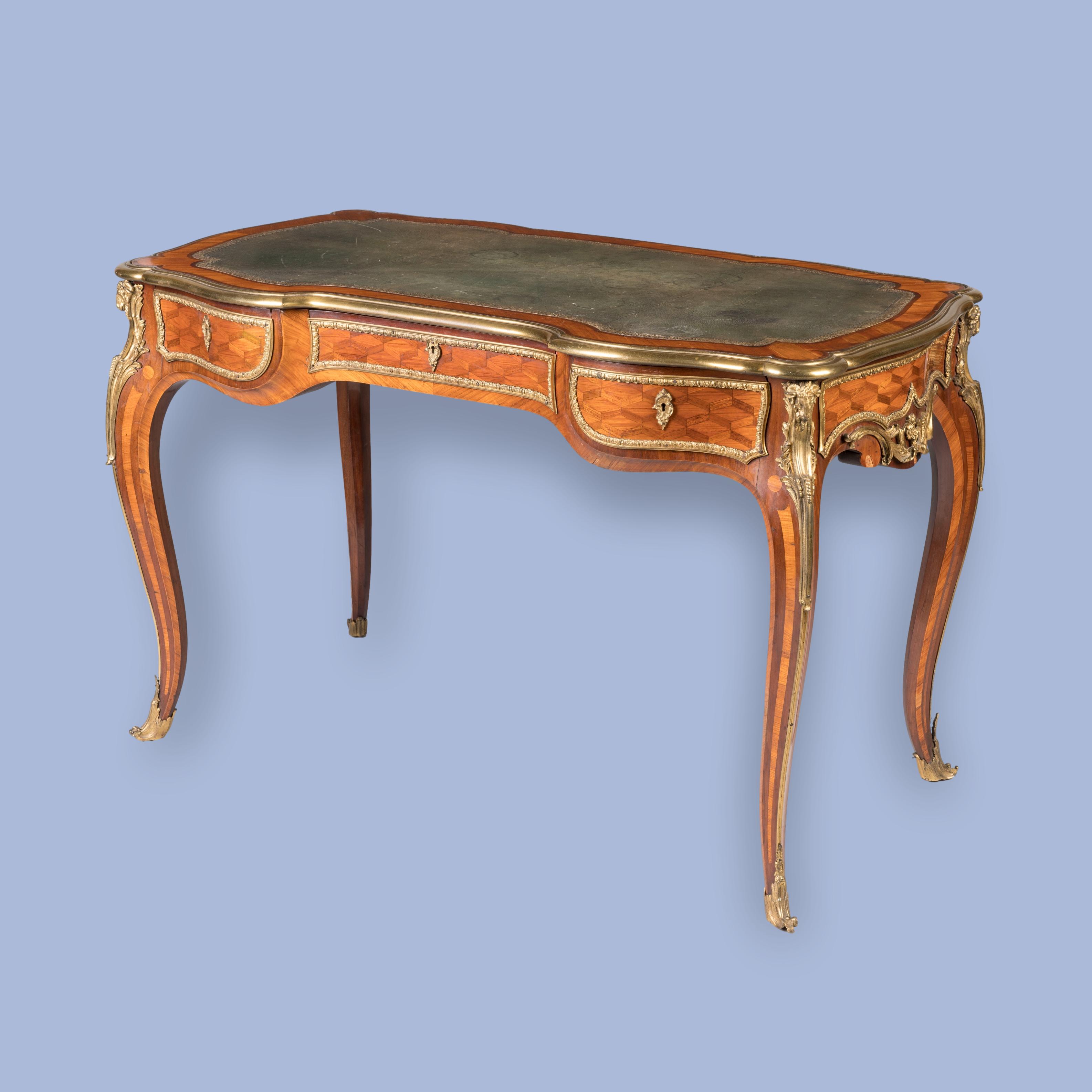 Designed with the elegant curves typical of the Louis XV era, the writing table is constructed from tulipwood with amaranth crossbanding and dressed with fine ormolu mounts, supported on cabriole legs with foliate sabots and unusual rams’ head espagnolettes, the undulating frieze housing three lockable drawers faced with cubed parquetry which is repeated to the other fascia, the top set with a leather writing surface with gilt tooling.