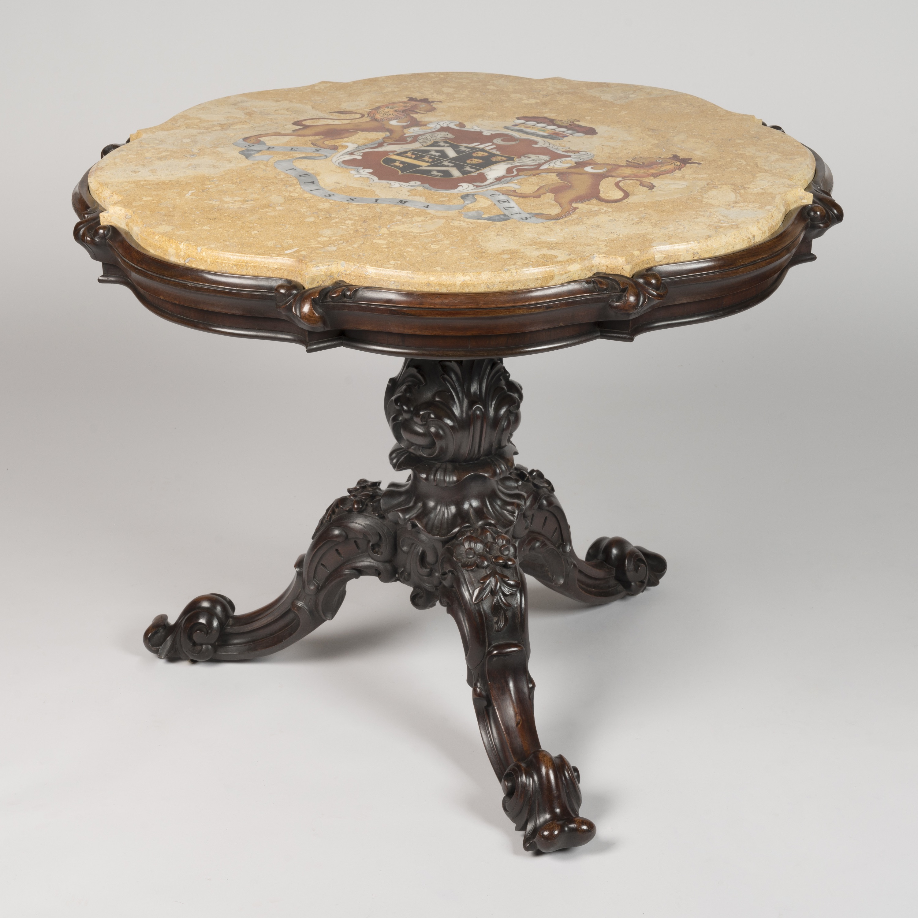 The shaped circular top finely inlaid with the arms of General Robert Edward King, 1st Viscount Lorton (1773–1854), masterfully executed in pietra dura and specimen marbles upon a fossil-rich yellow marble ground. The inlaid work is of exceptional delicacy, having all the hallmarks of the greatest heraldic tops by the famous makers, including the use of delicate shaded marbles.