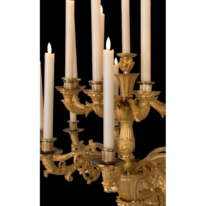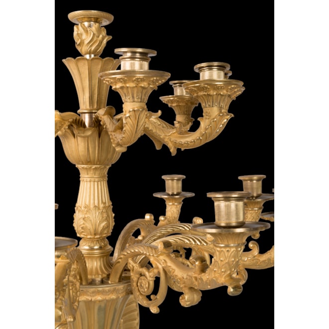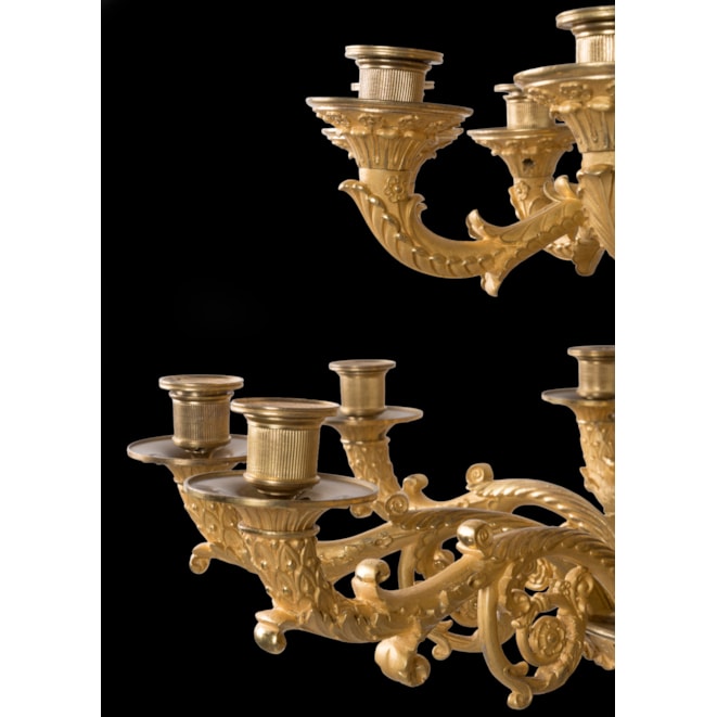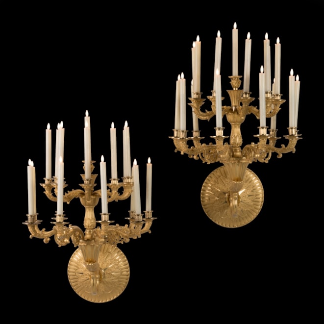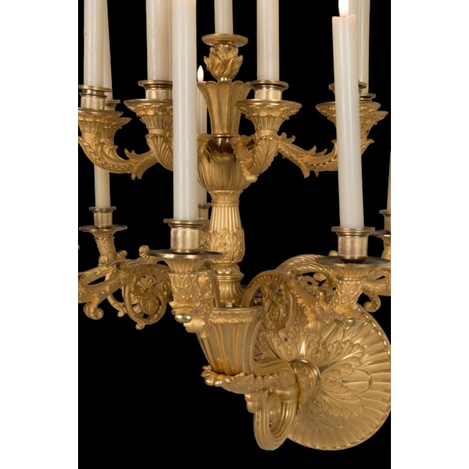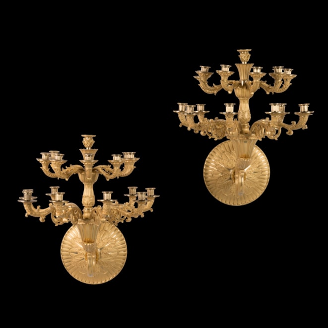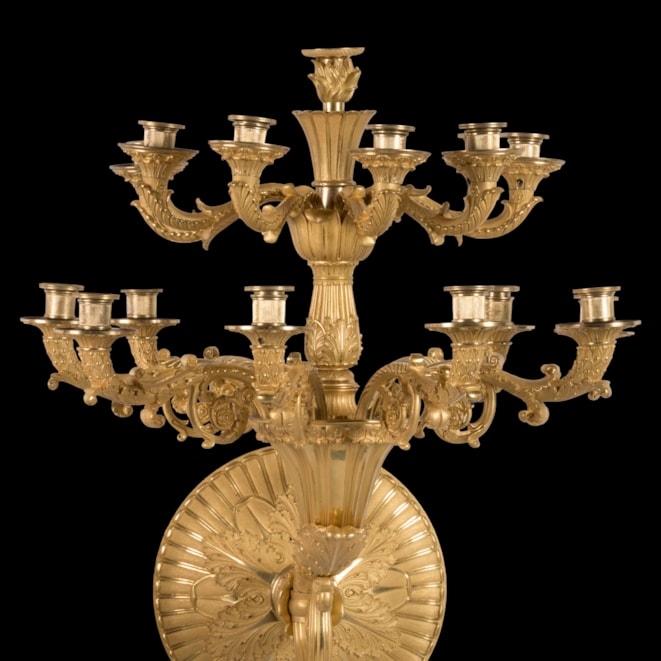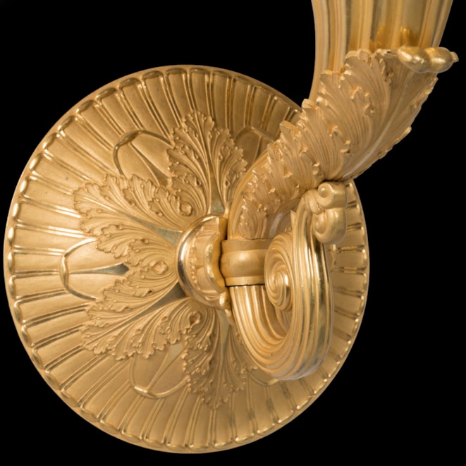Of superlative quality and scale, constructed entirely from fire-gilded bronze with meticulous decorative hand-chasing, planishing and burnished highlights, each wall applique emerging from a circular patera with radiating foliate decoration issuing a single large cornucopia with scrolled end, dressed with stylised acanthus and with a large multi-tiered canopy, the bottom register with eight acanthus-wrapped arms and scrolled ornament, the drip pans with burnished berried olive leaves, the upper register emerging from a lotus leaf corona with a further set of curved arms, the drip pans decorated with stylised flowers.