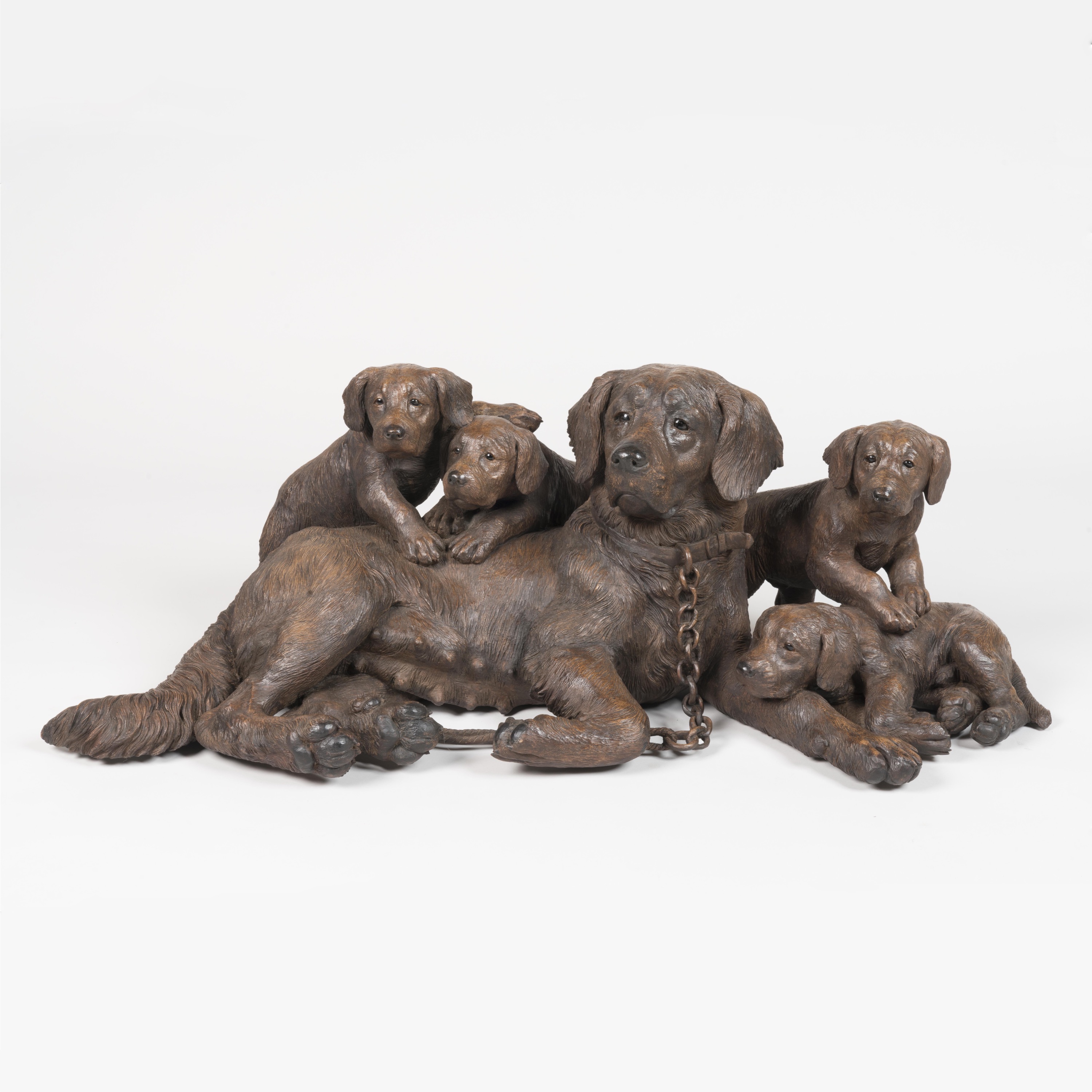 The largest and most magnificent of its kind, this limewood hand-carved St. Bernard dog group shows the mother couchant and her four playful pups, all with glass inset eyes, a collar around her neck with an expertly carved chain and twist rope.