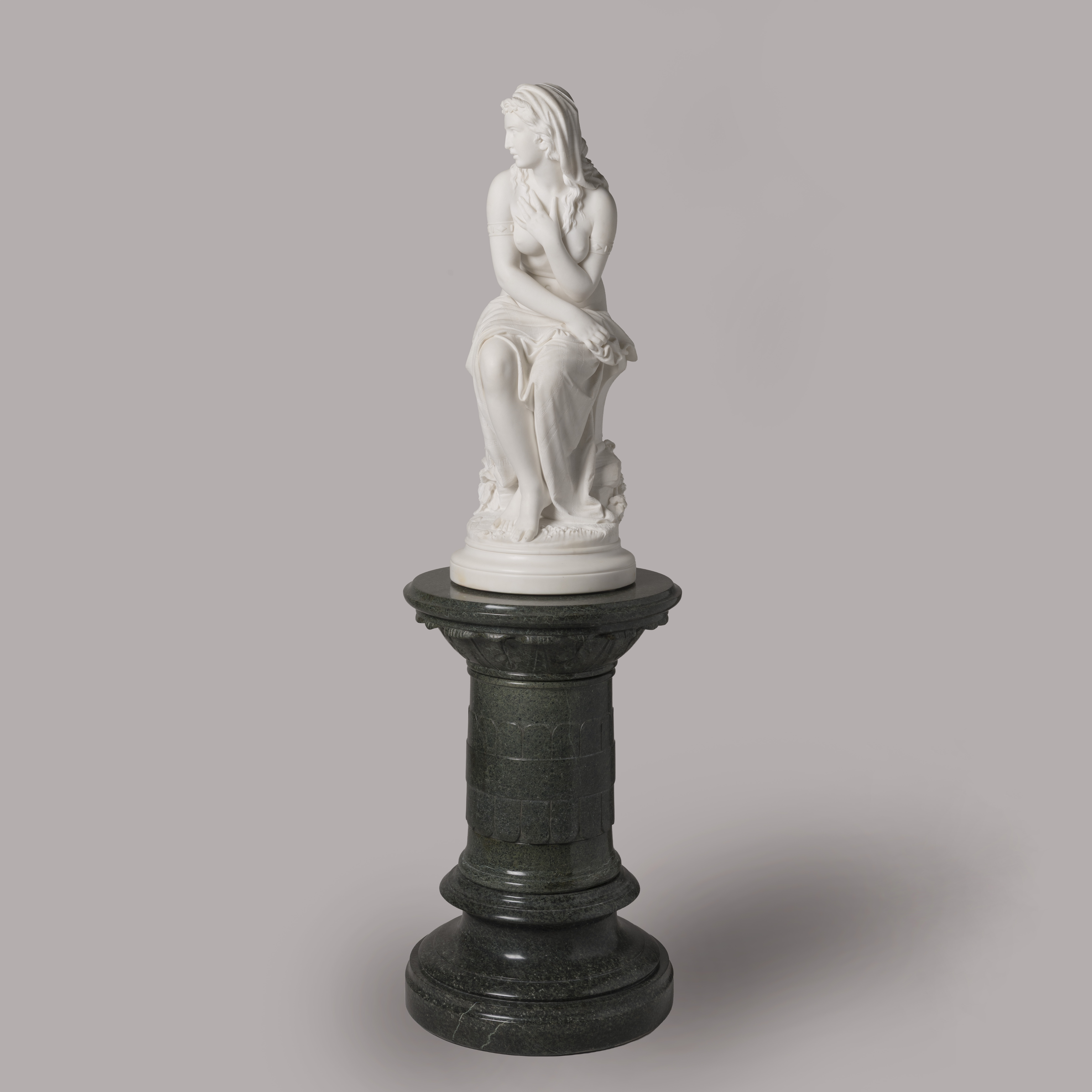 Sculpted from white statuary marble, the seated figure of the Biblical Susanna, seated in a state of half-undress as she bathes, her gaze directed to her dexter covering her bosom from unwelcome glances, her delicate features, purity and beauty enlivened with extraordinary realism. Raised on a verde antico circular pedestal with carved details. The figure signed and dated 'Achille Bianchi fece / Roma 1886.'
