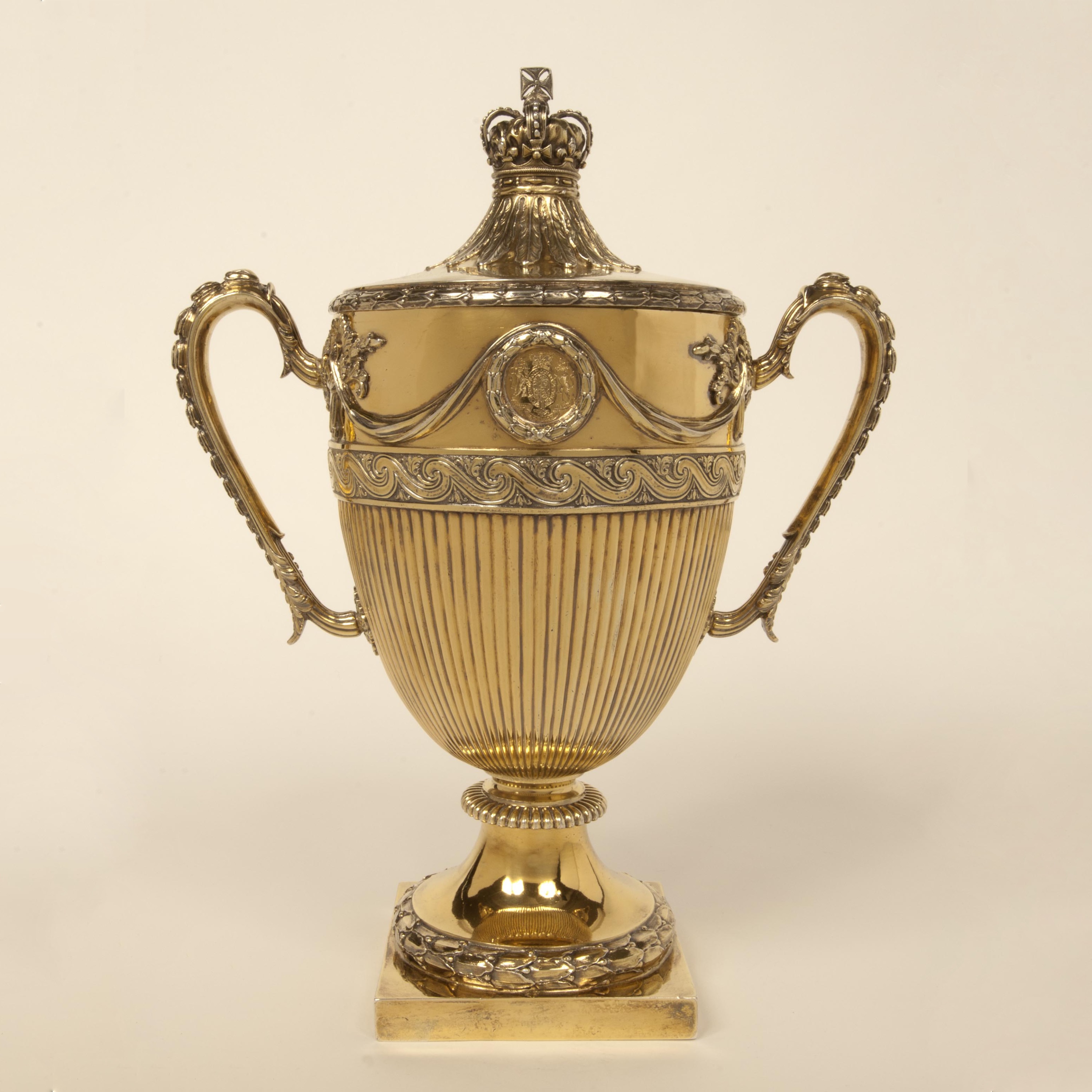 The leaf cast cover with a Royal Crown finial and laurel wreath rim, the urn being cast with Vitruvian scrolls and the Royal Crest, the Montagu coat of arms on the reverse, the handles with trailing bellflowers, on a lobed socle ending in a laurel garland circular foot and square base, inscribed on the interior rim of the cover 'This cup was given by His Majesty King George the 3rd (sic) to his godson The Hon. George Montagu Born ye 4th of Feb, Baptized ye 5th of March 1773.' The silver hallmarked for London 1771/2.