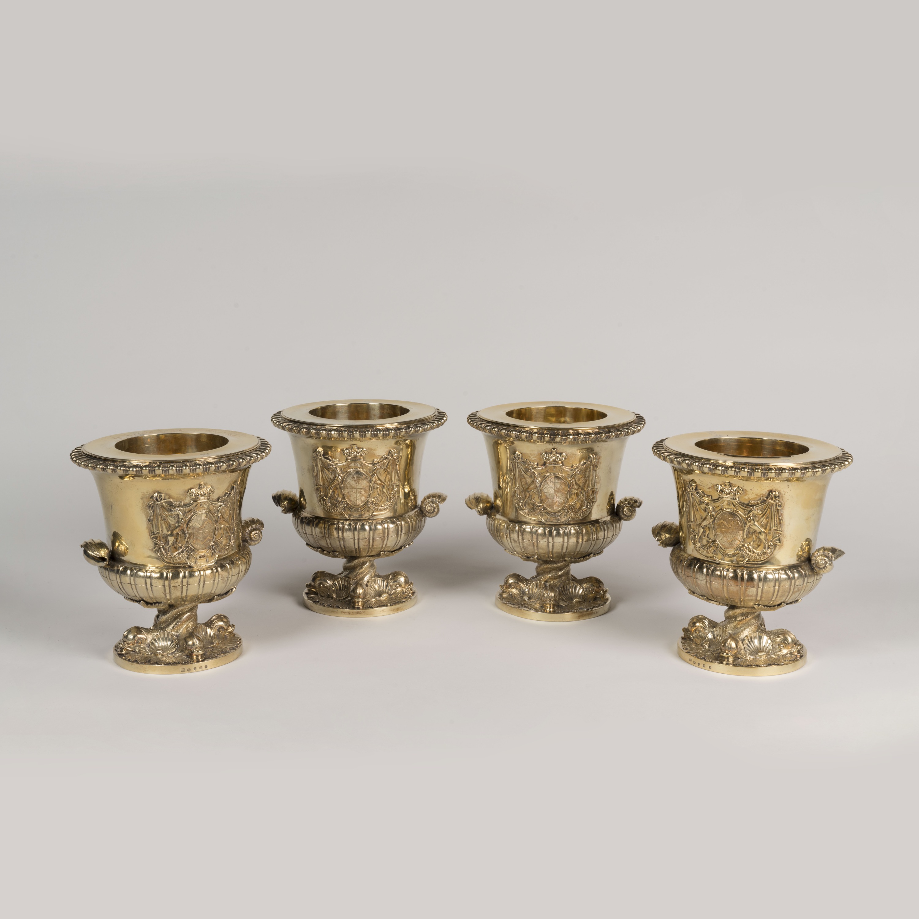 Each of campana form with bold cast shell handles and entwined dolphin bases, the bodies applied with drapery cartouches engraved with the arms of Thomas Robinson, 3rd Baron Grantham. Bearing the maker's mark of Robert Garrard.