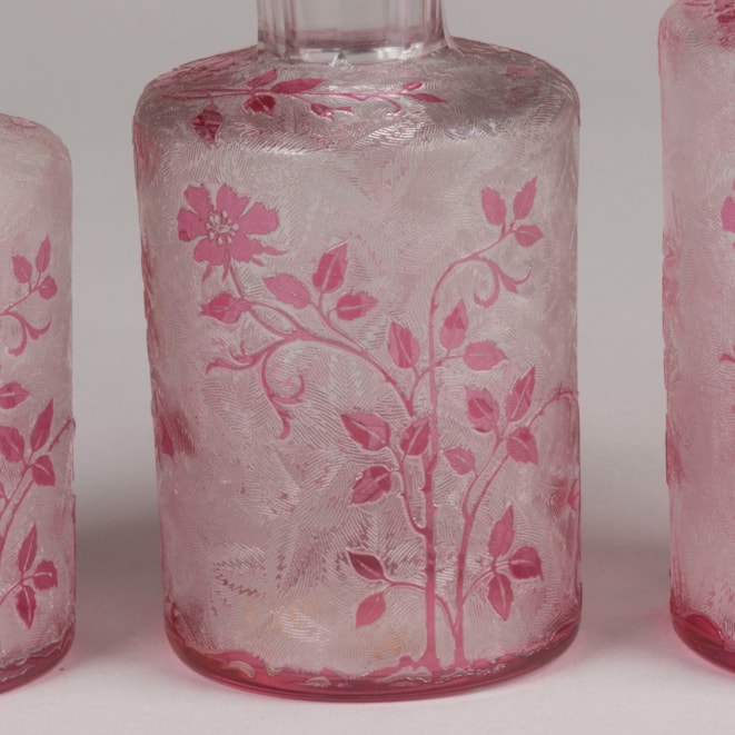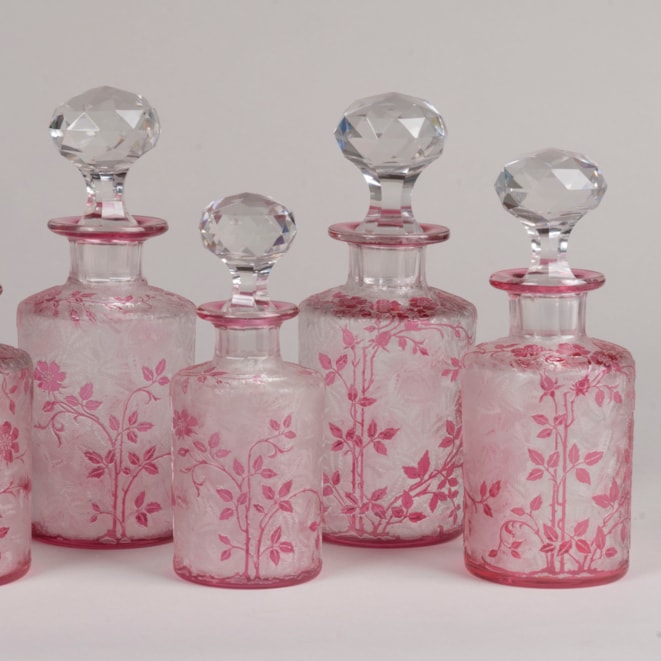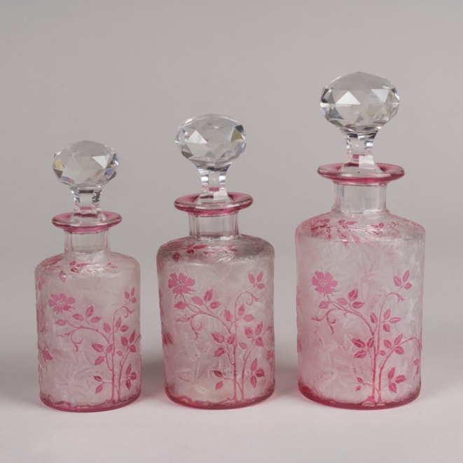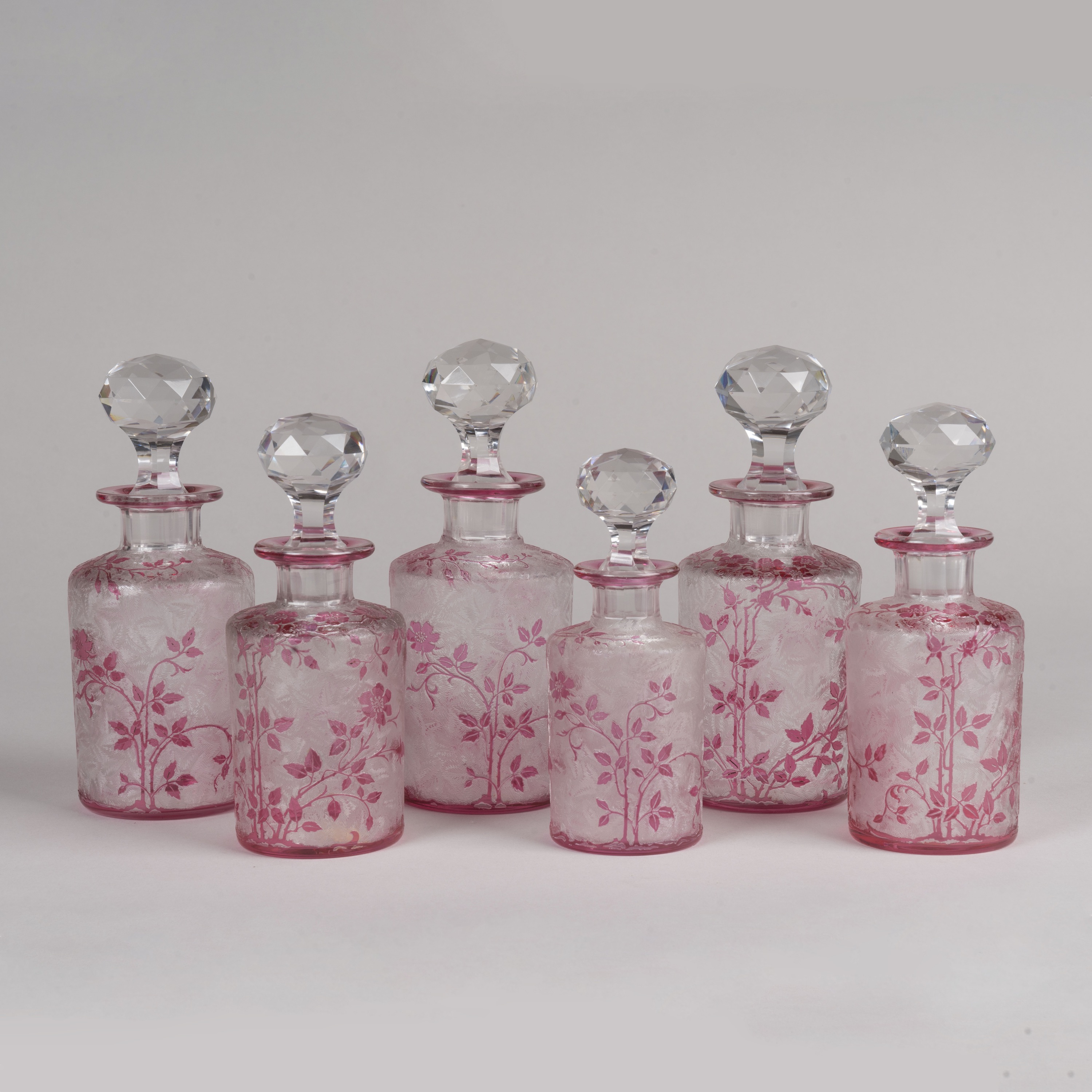 One of the most refined Art Nouveau offerings by the famous company, the pink overlay bottles with a design of wild roses, fruit and foliage on an acid-etched leafy background, with the original faceted stoppers. One with the paper label of Baccarat.