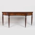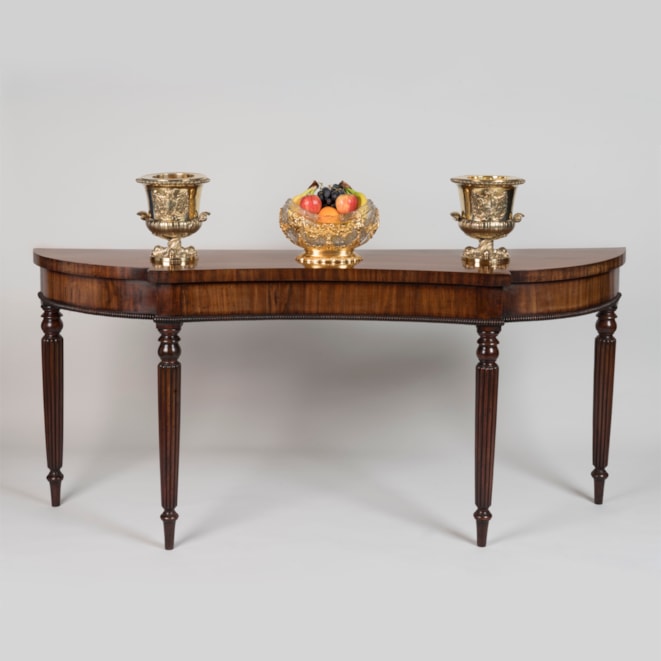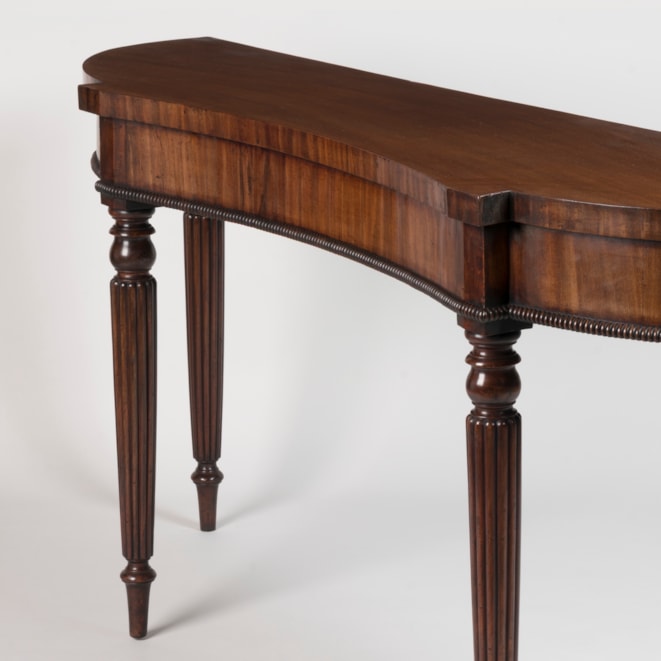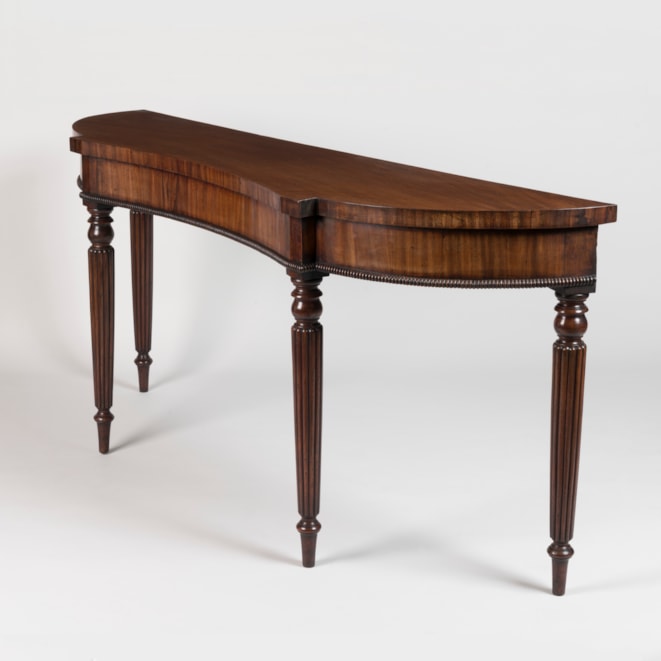 An elegant mahogany serving table, the top of slight breakfront shape with concave edge and rounded ends, finely veneered frieze and carved beaded moulding, on turned and tapering legs with carved reeding.