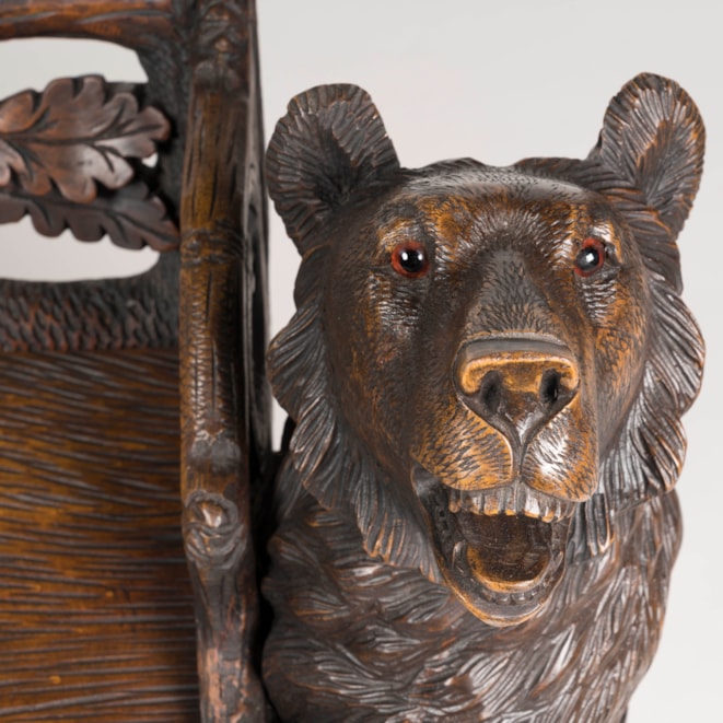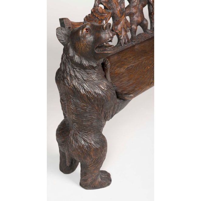 Constructed in carved Lindenwood, the seat supported by two free-standing bears; the frame of the bench modelled from branchwork with a carved bear in the central roundel amongst oak foliage, the seat carved to simulate a tree bark.