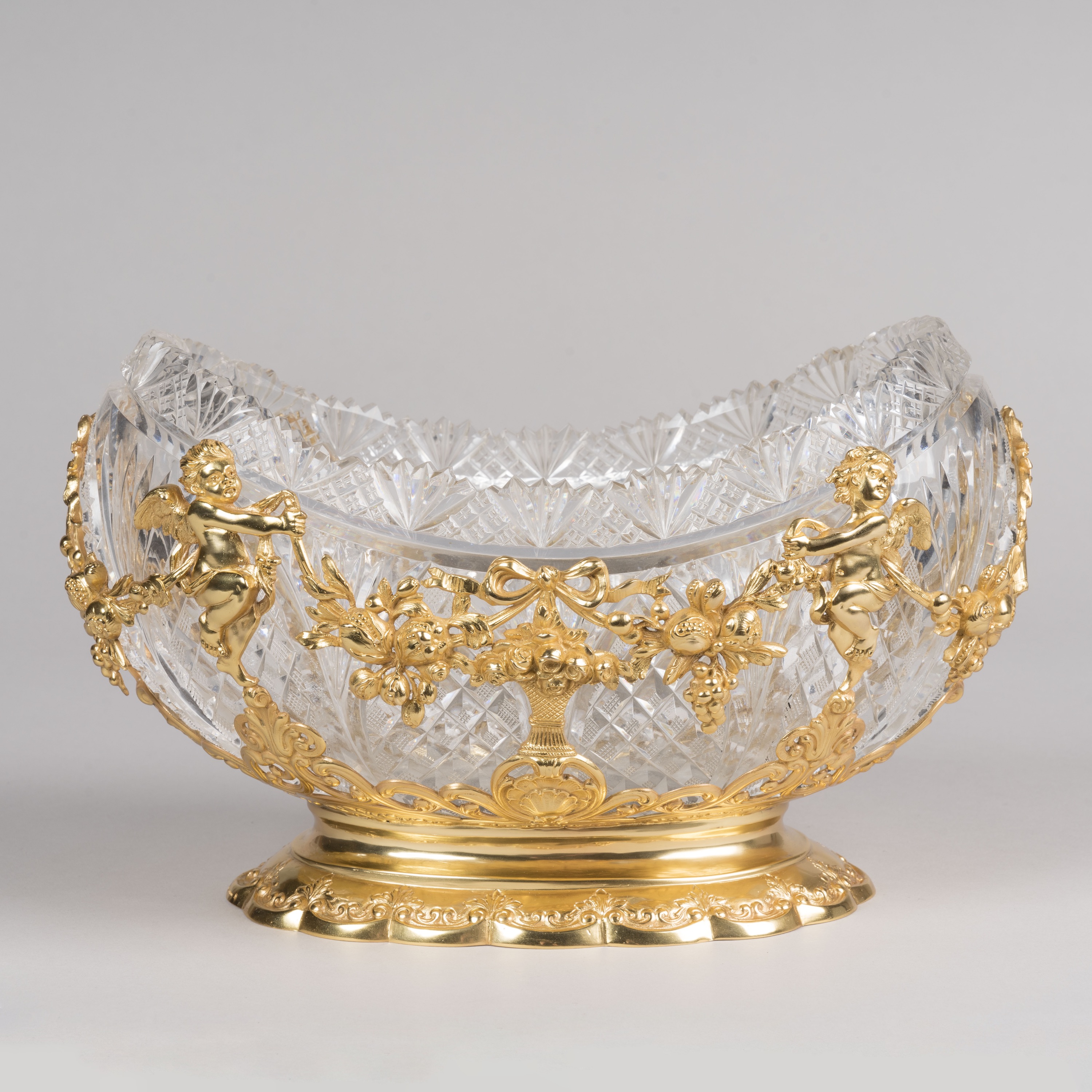 The lead-crystal concave bowl of coracle shape with cut diamond pattern and hatched details cradled within the silver gilt surround, each side featuring a ribbon-tied floral basket flanked by winged cherubs connected by fruit-laden garlands. The shaped foot fully marked denoting the maker and 800 purity.