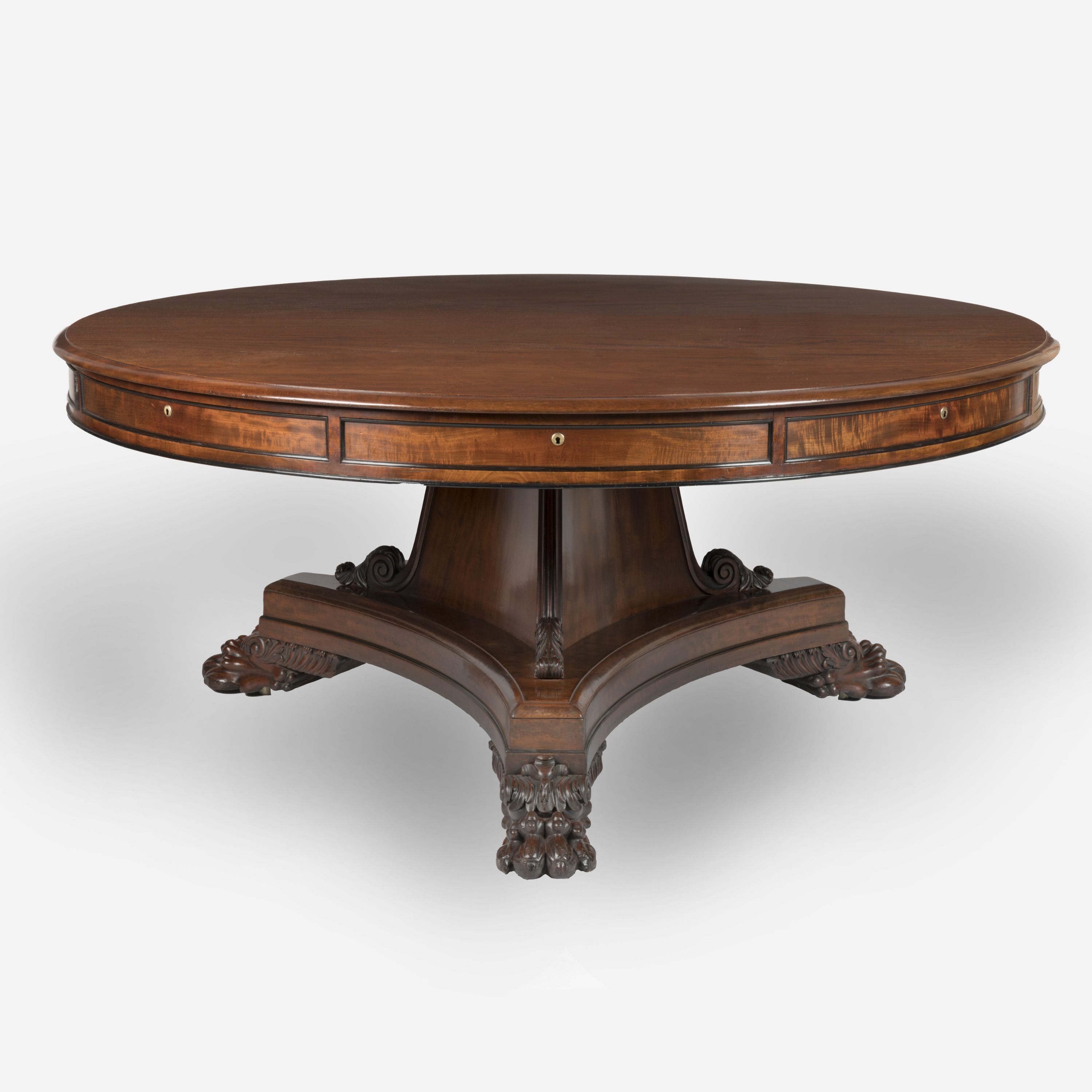 Undoubtedly inspired by the most fashionable Regency period furniture of the early 19th century, this table combines great design with superb craftsmanship. Drum tables of this kind were made by craftsmen such as George Bullock and companies such as Gillows, who had access to the best available timbers on the market.