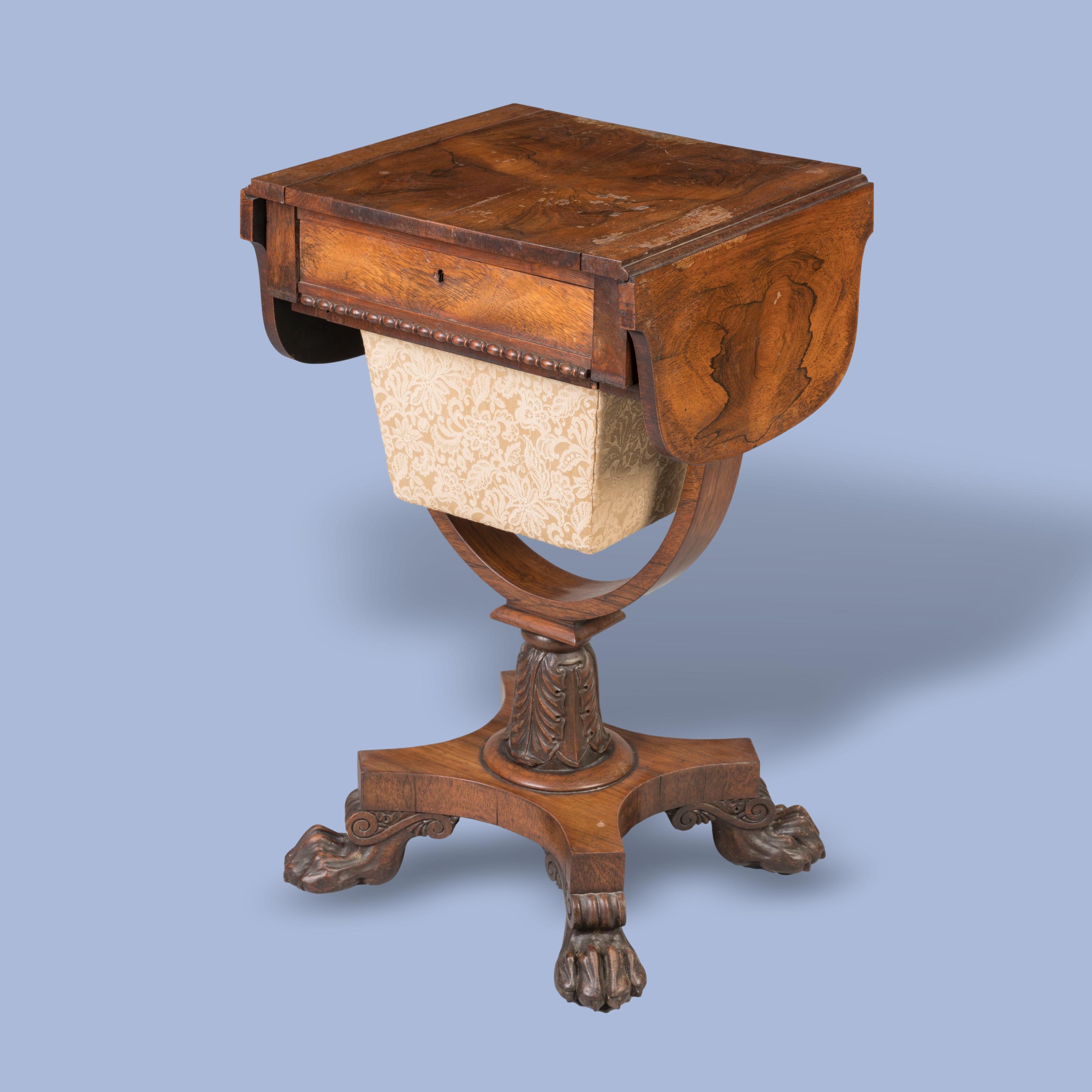 Constructed from rosewood, the top bookmatched to showcase the striking grain, with a pair of hinged drop leaves to either side, the sliding central panel with a chess board to the reverse and revealing a leather embossed backgammon board, a single drawer with fitted box, supported on a single pillar, incurved platform base raised on carved lion paw feet.