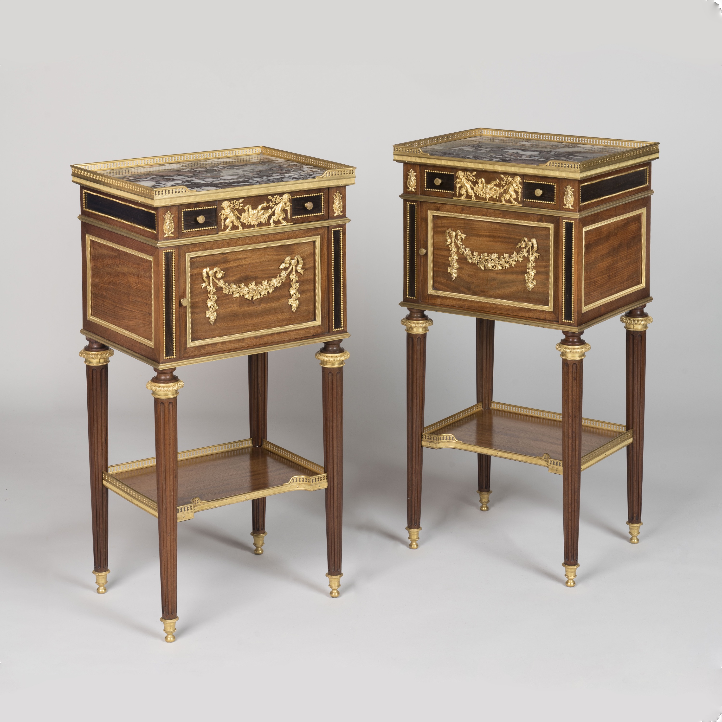 A pair of French neoclassical style bedside cabinets constructed from mahogany, enlivened with ebony and decorated with ormolu mounts retaining their original gilding, each surmounted by its original fleur-de-pêcher marble top with a pierced ormolu three-quarter gallery, the frieze enclosing a drawer set with a bacchic ormolu relief of frolicking putti, the white marble-lined cupboards accessed via a single door set with ribbon-tied grapevine swags, supported on tapering fluted legs terminating in ormolu tipped feet and joined by a mahogany undertier.
