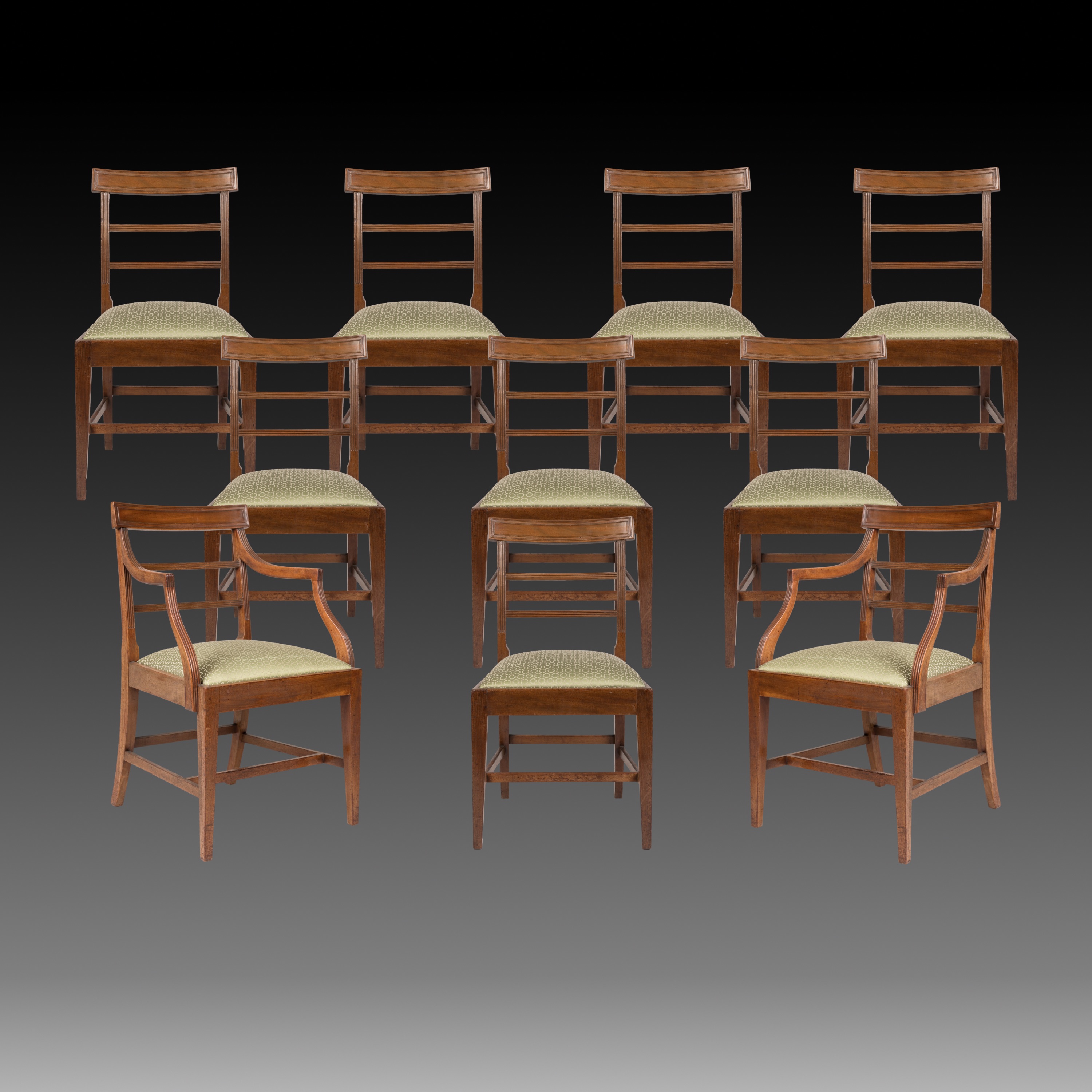 Constructed of mahogany, the set comprising two carvers and eight side chairs, each chair with a gently curved top rail above a ladder-back design of horizontal splats, standing on square-section legs of slight taper and connected by stretchers. The carvers with gently curving arms, reeded and meeting the frame at finely joined uprights.
