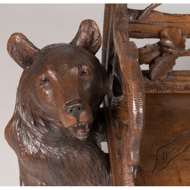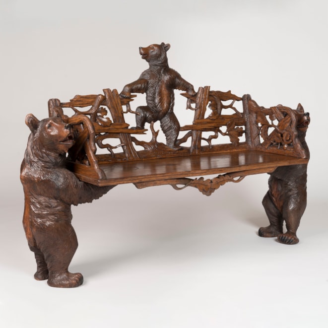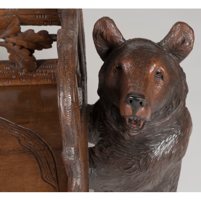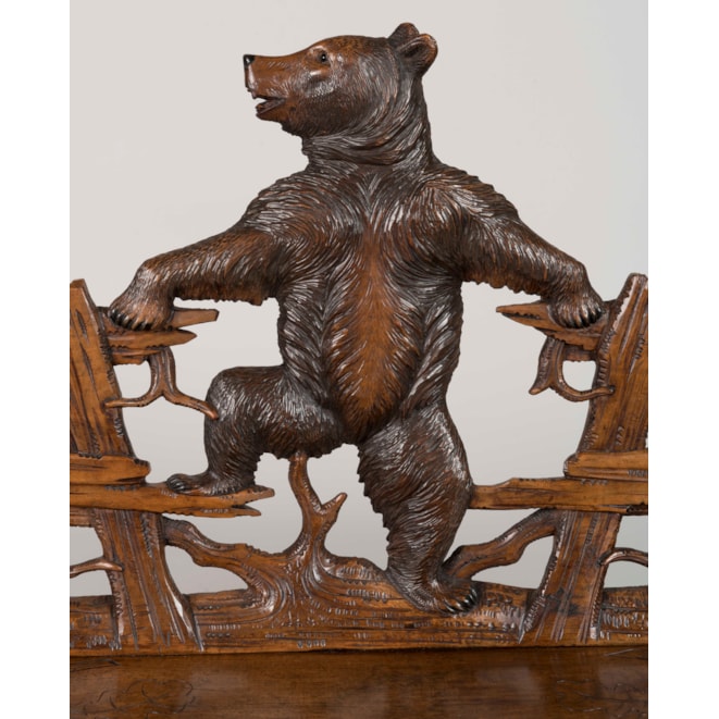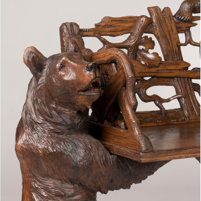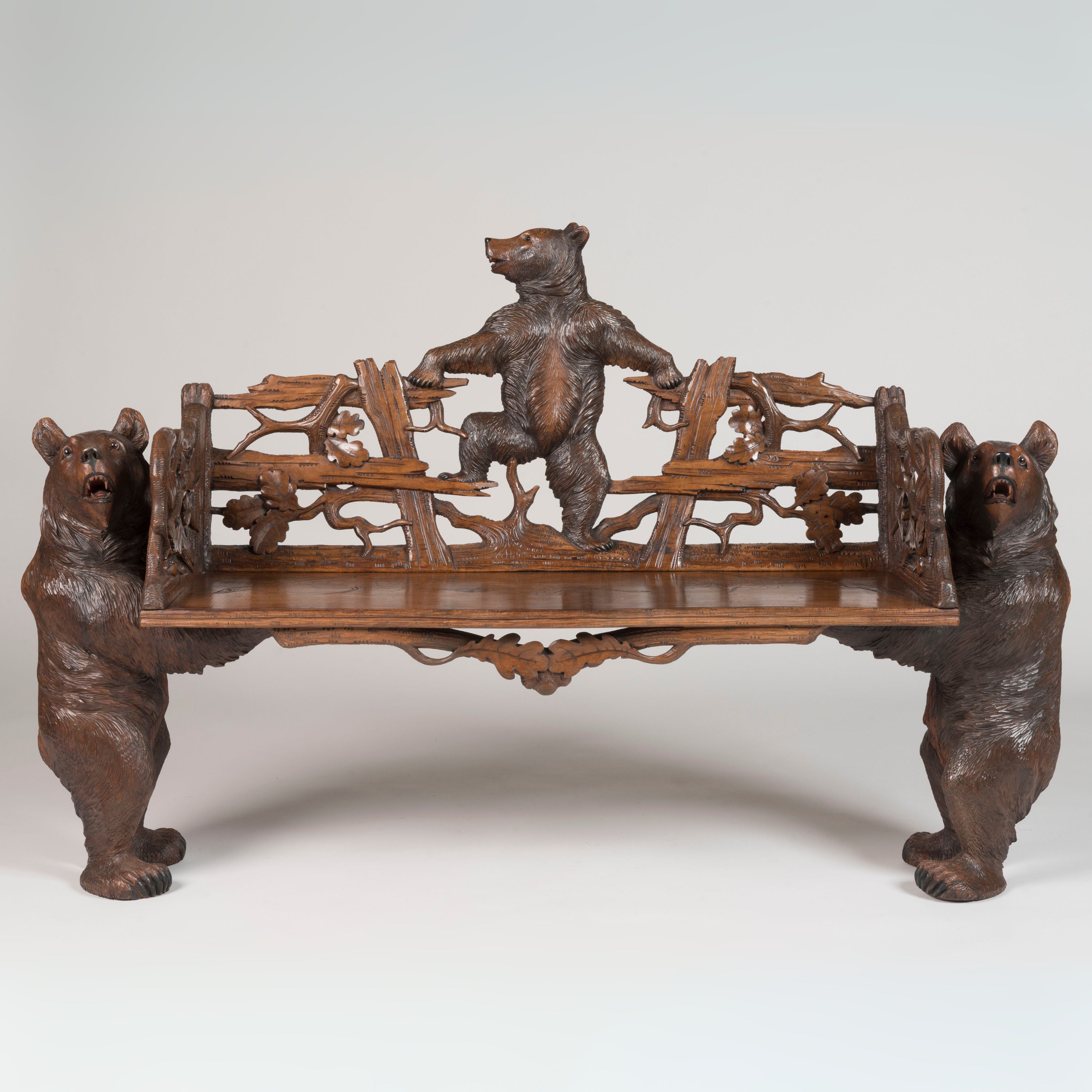 Constructed in carved Lindenwood, the seat supported by two free-standing bears; the frame of the bench modelled from branchwork with a carved bear in the central backrest flanked by open fencing with oak foliage continuing as armrests, the seat carved with further leafy oak branches in shallow relief and with a carved apron bearing a pair of carved oak leaves.
