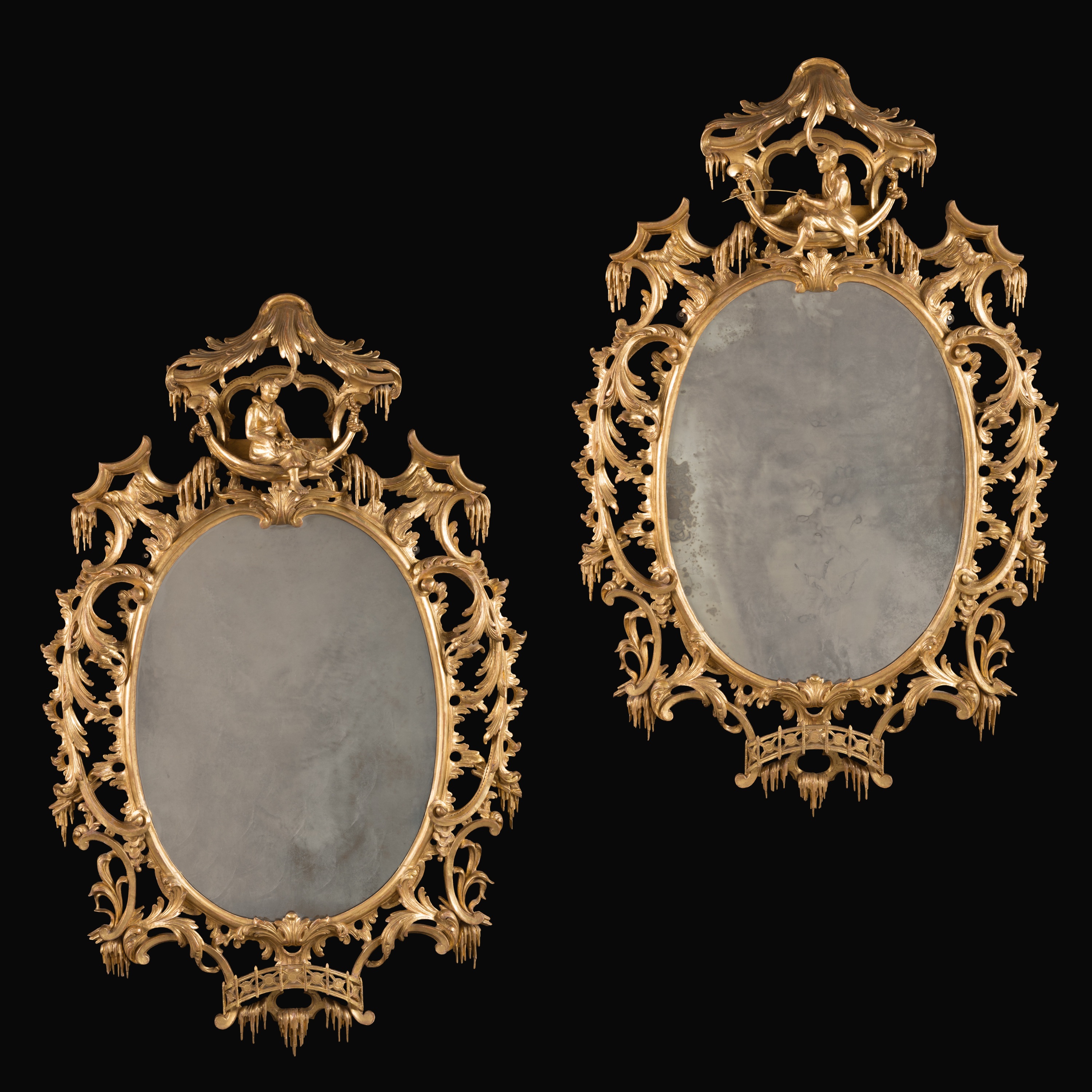 The oval mirrored plates surrounded by elaborate carved giltwood frames in the manner of John Linnell, each mirror surmounted by a carved Oriental figure fishing from a suspended hammock beneath an acanthus leaf shelter, flanked by shaped pagoda roofs with trailing scrolls of stylised acanthus, cascading waterfalls, and a small arch bridge with pierced parapet below.