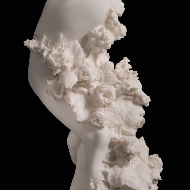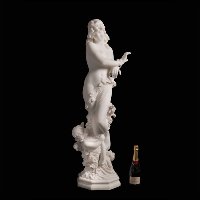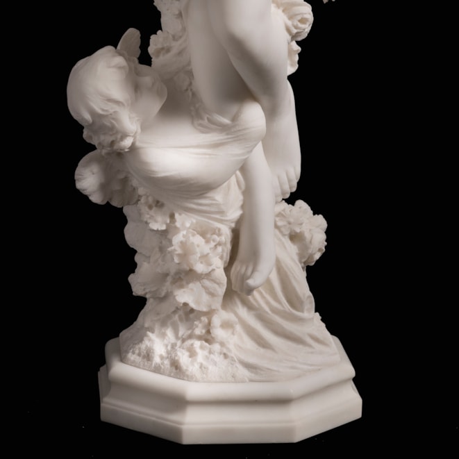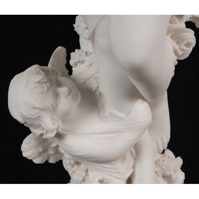 Carved from statuary marble, the large sculpture depicting a nymph, wrapped in in billowing shawl and floral garlands as winged Cupid glances up at her. Signed 'C. Lapini / Firenze' and dated 1893.