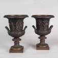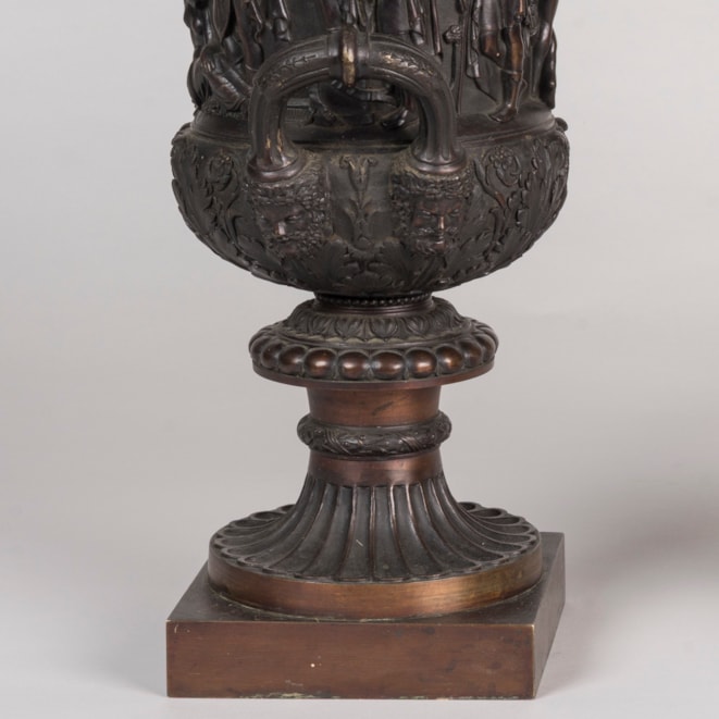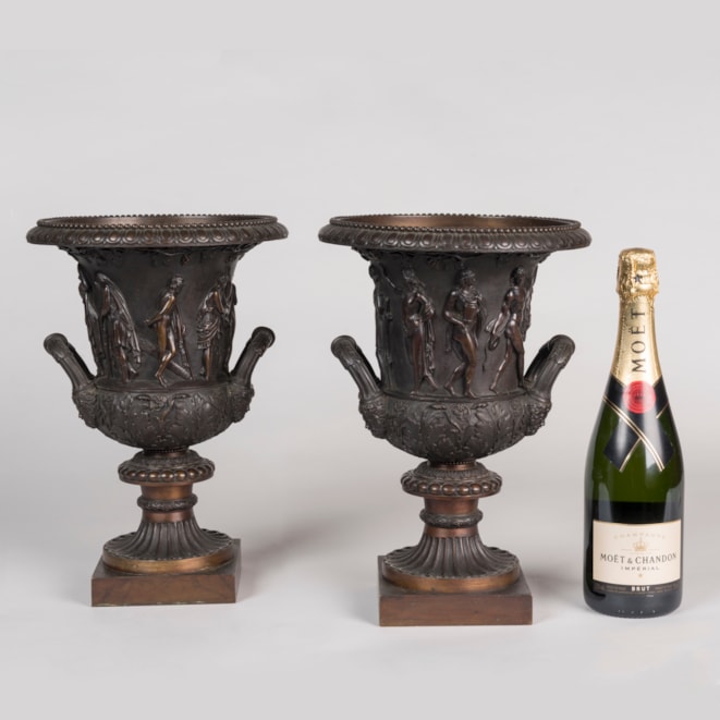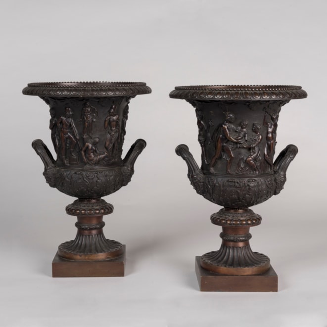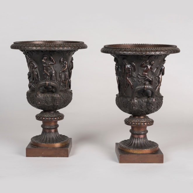 Cast from patinated bronze, both vases of Medici form with twin-handles and fluted socles, one figural relief scene based on the famous Medici Vase, while the other is based on the Borghese vase.