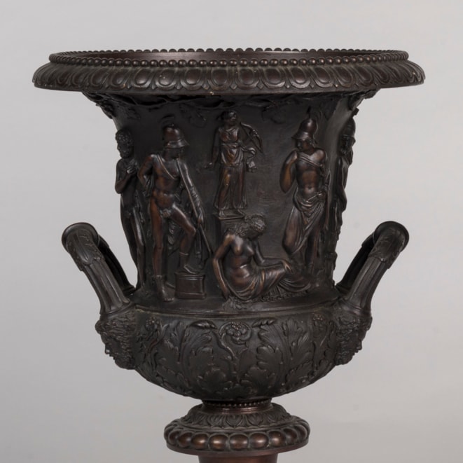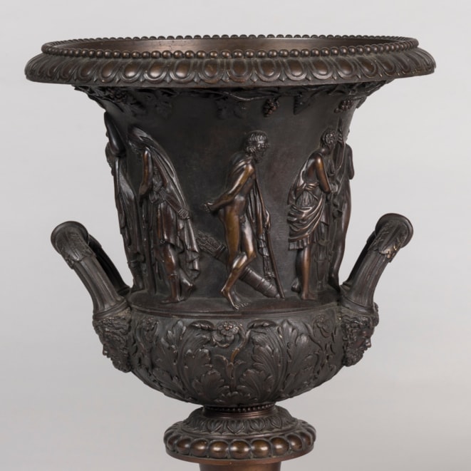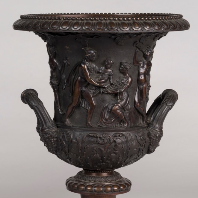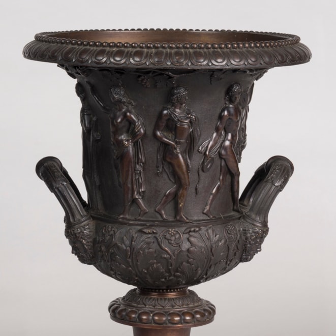 The Medici vase, discovered in the 1570s and now in the Uffizi, which inspired one of the friezes and the overall form. This vase has been consistently copied since its excavation and remained a popular reference point in neoclassical decoration well into the Regency period and beyond.