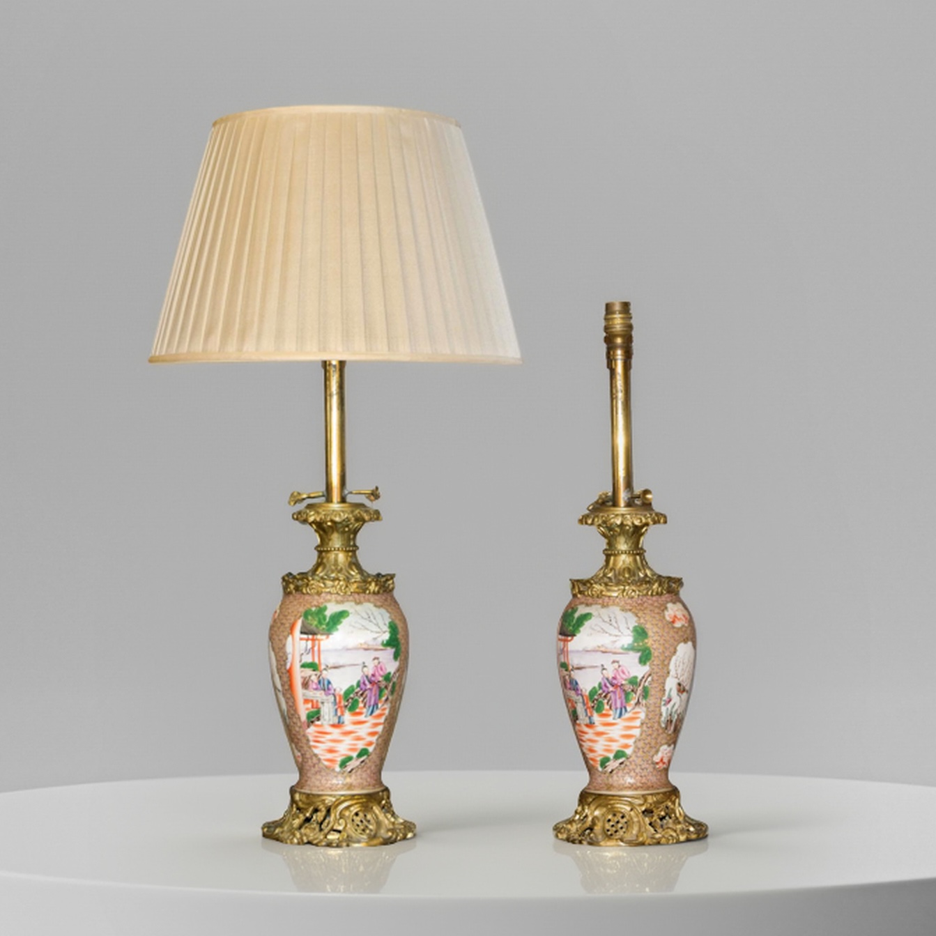 Hand painted in the 'Mandarin' palette - the polychromes depicting court and genre scenes, mounted on gilt bronze rococo bases