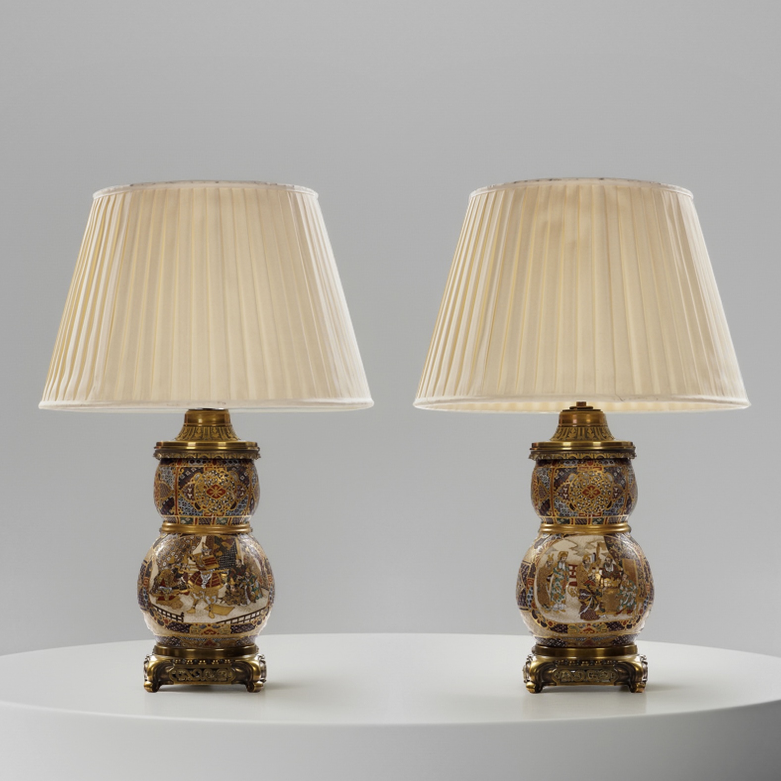 A pair of vintage Japanese porcelain vase lamps of waisted form, dressed with French ormolu mount of unusual double gourd form, very finely painted with court officials, samurai, and gilded; dressed with high-quality French ormolu bronze mounts.