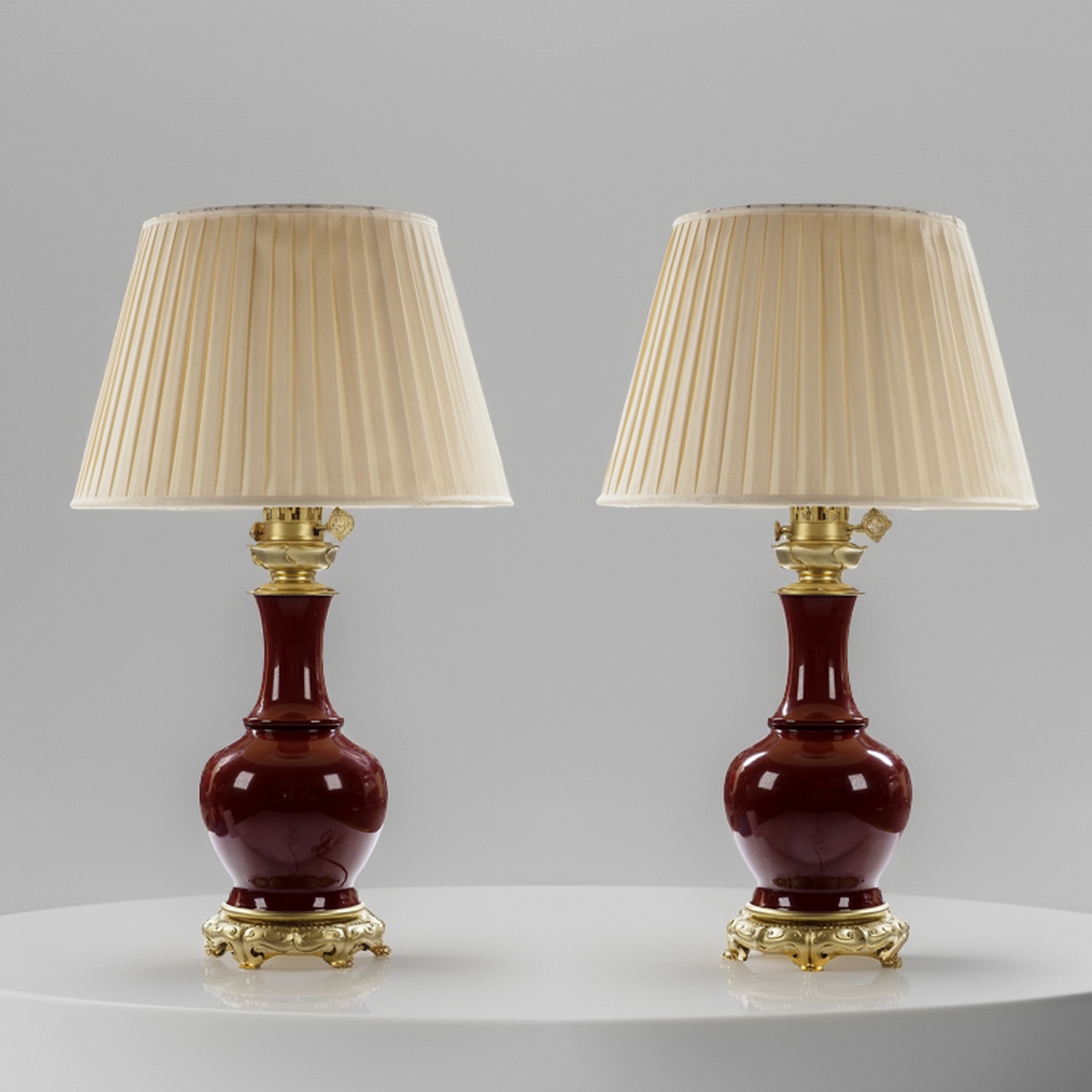 A pair of vintage Chinese Sang de Boeuf(Bull's Blood) porcelain antique vase lamps of stepped bottle form, dressed with French ormolu mounts. This pair, with the rich red coloration of Sang de Boeuf effected by use of copper in the glaze, had been employed in decoration since the Sung dynasty. Originally the vases were employed as oil lamps and fitted with ormolu bases in the oriental taste and oil reservoirs and burners. Thus, artistic effort, knowledge, and tradition was combined with typical Victorian practicality, and with our adaptation for electricity, a century and a half later, the decorative lighting function is in use again.