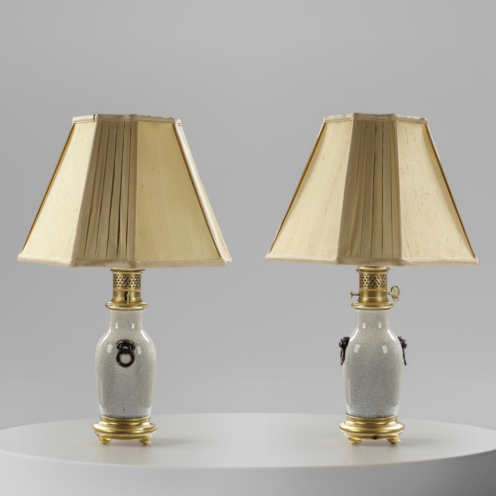 A pair of vintage Chinese crackleware antique vase lamps of baluster form, having applied Taotie masks dressed with French Ormolu mounts. These baluster form pale blue crackleware vases, dressed with Taotie masks, to discourage evil spirits, and dressed with bronze mounts in the Ming manner, were brought to the West, and, with a stroke of inspiration employed as oil lamps, being fitted with ormolu bases in the oriental taste and oil reservoirs and burners; here, the original wick adjusters are retained. Thus, artistic effort, knowledge, and tradition were combined with typical Victorian practicality, and with our adaptation for electricity, a century and a half later, the decorative lighting function is in use again.