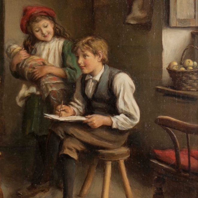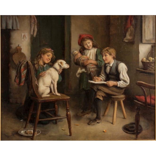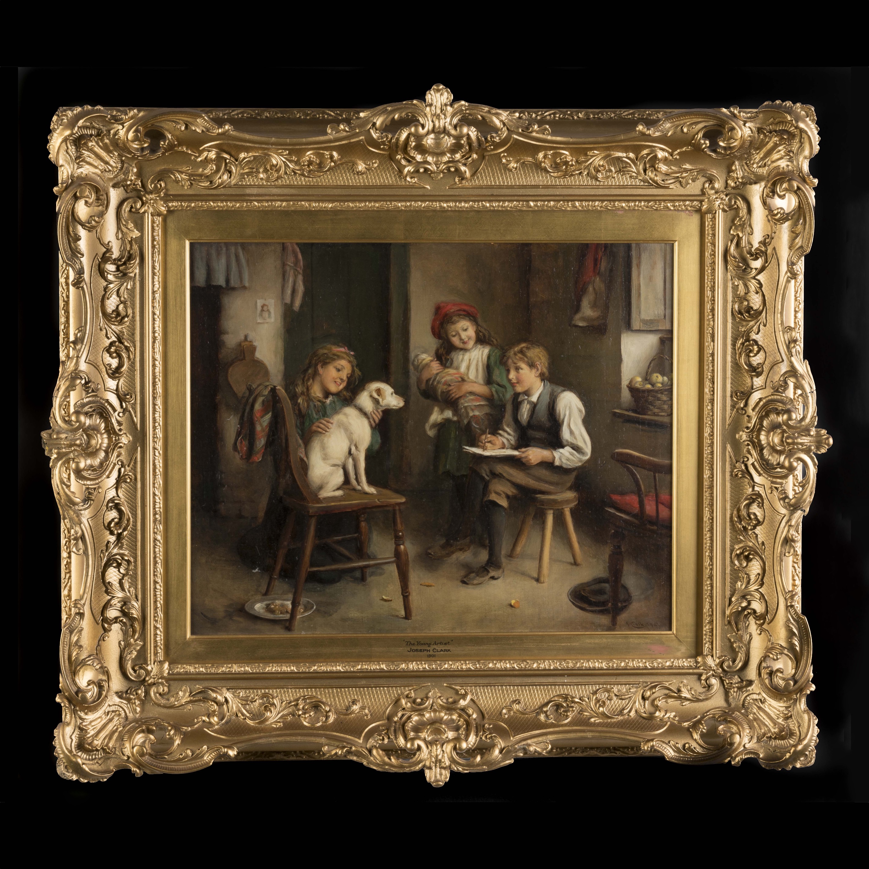 Executed in oil on canvas, depicting a young boy seated on a stool as he draws the dog sitting for him, in the company of two girls. Housed within a swept giltwood frame. Signed and dated lower right 'J. Clark 1901.'