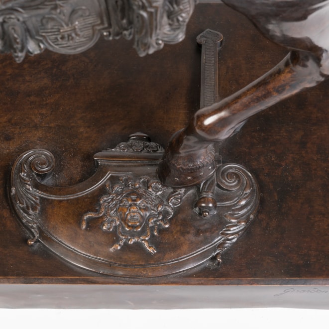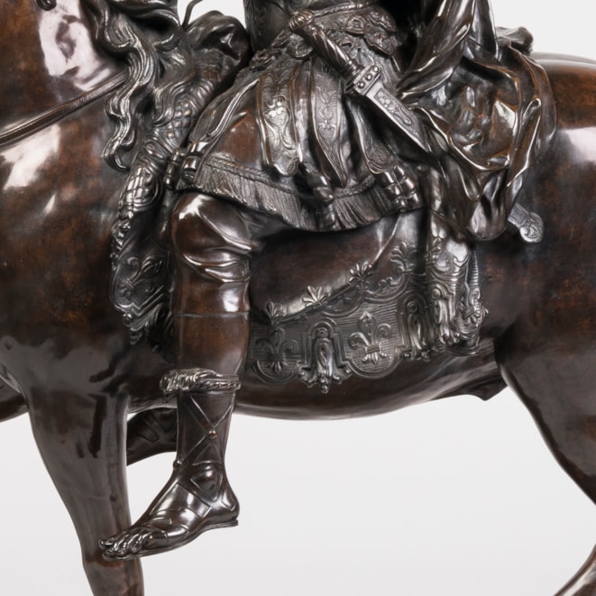 Girardon worked on the model from 1685 to 1687 and depicted Louis XIV as a Roman emperor in the manner of antique classical statues albeit wearing a contemporary voluminous long curling wig. The king with lofty and imperial stance sits astride his mount with no saddle and stirrups to show the mastery of his horsemanship and his saddlecloth is edged with fleurs-de-lis whilst his horse tramples the sword and shield of a defeated enemy.