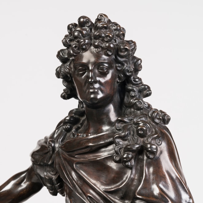 Cast in a dark patinated bronze, the statue depicts the Sun King as a Roman Emperor, and is signed to the side ‘Girardon.’