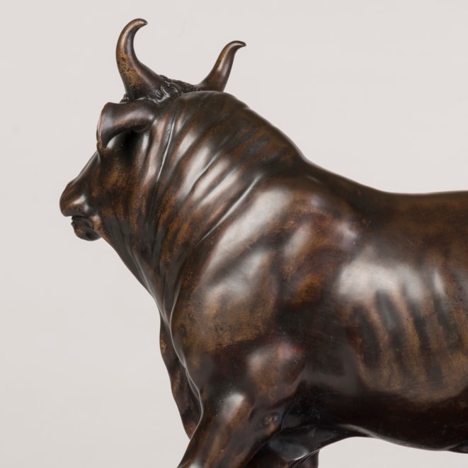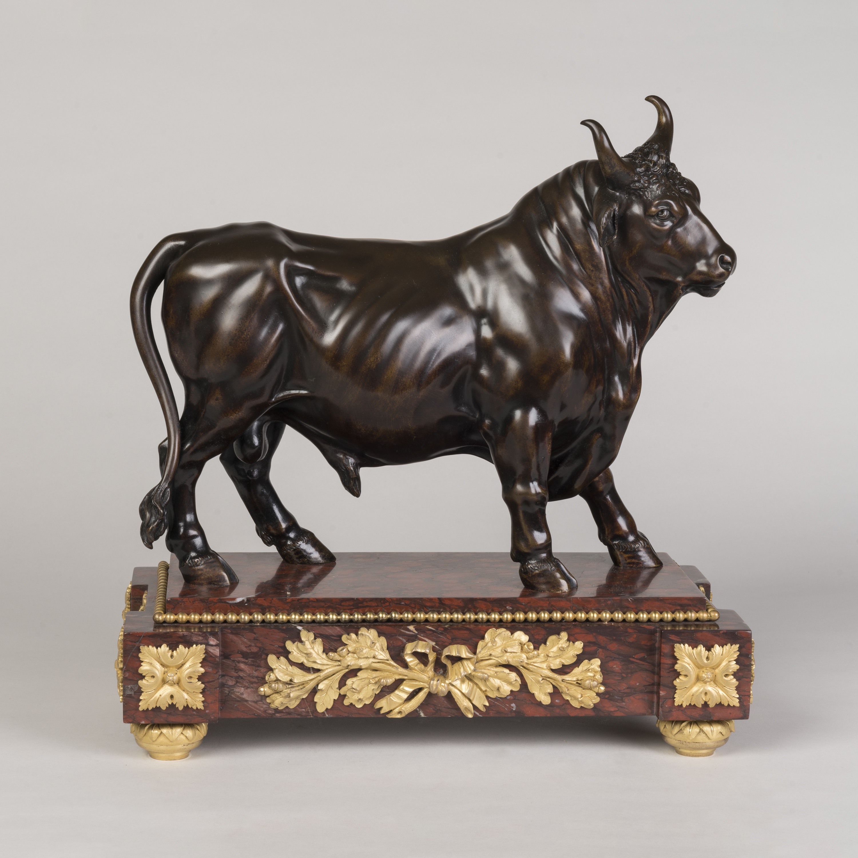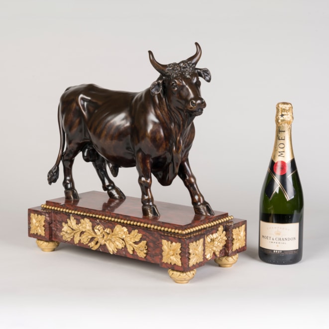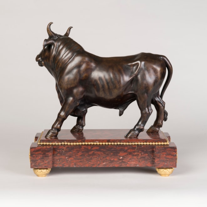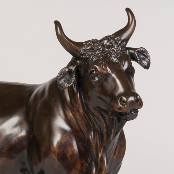 The prototype for this bull is a mottled grey marble from Classical Antiquity, excavated around 1775-1780 in Ostia and shortly after displayed in the Sala degli Animali at the Vatican. Bronze casts of the sculpture can also be found in the Ashmolean Museum in Oxford, in the Great Gallery at The Wallace Collection in London, and the Liebieghaus in Frankfurt-am-Main.